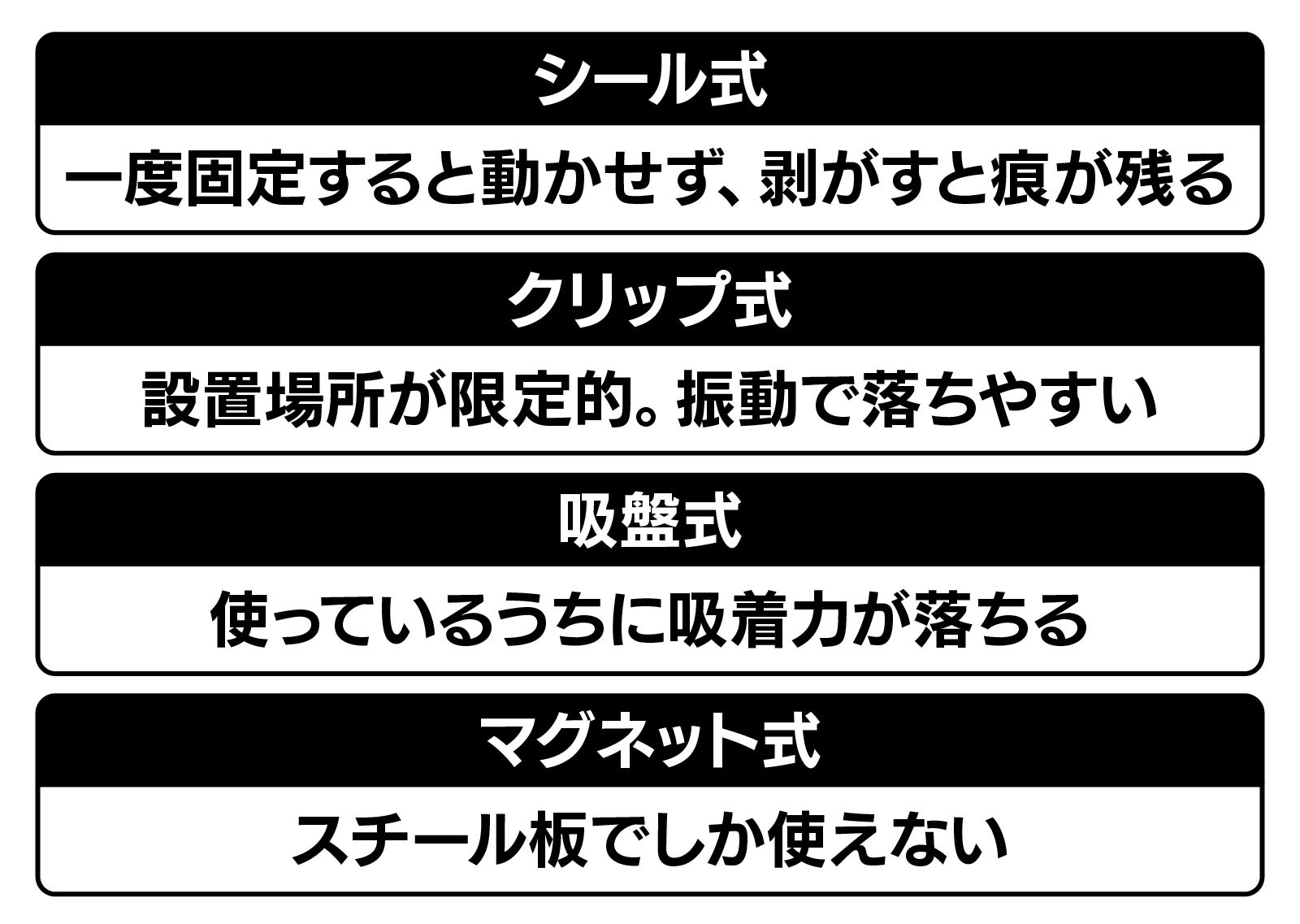 ※吸着するのは平滑面だけです。布や紙、革、凹凸がある面などには吸着しません。また取り付ける時は、固定面のホコリや汚れなどを取り除いてください。