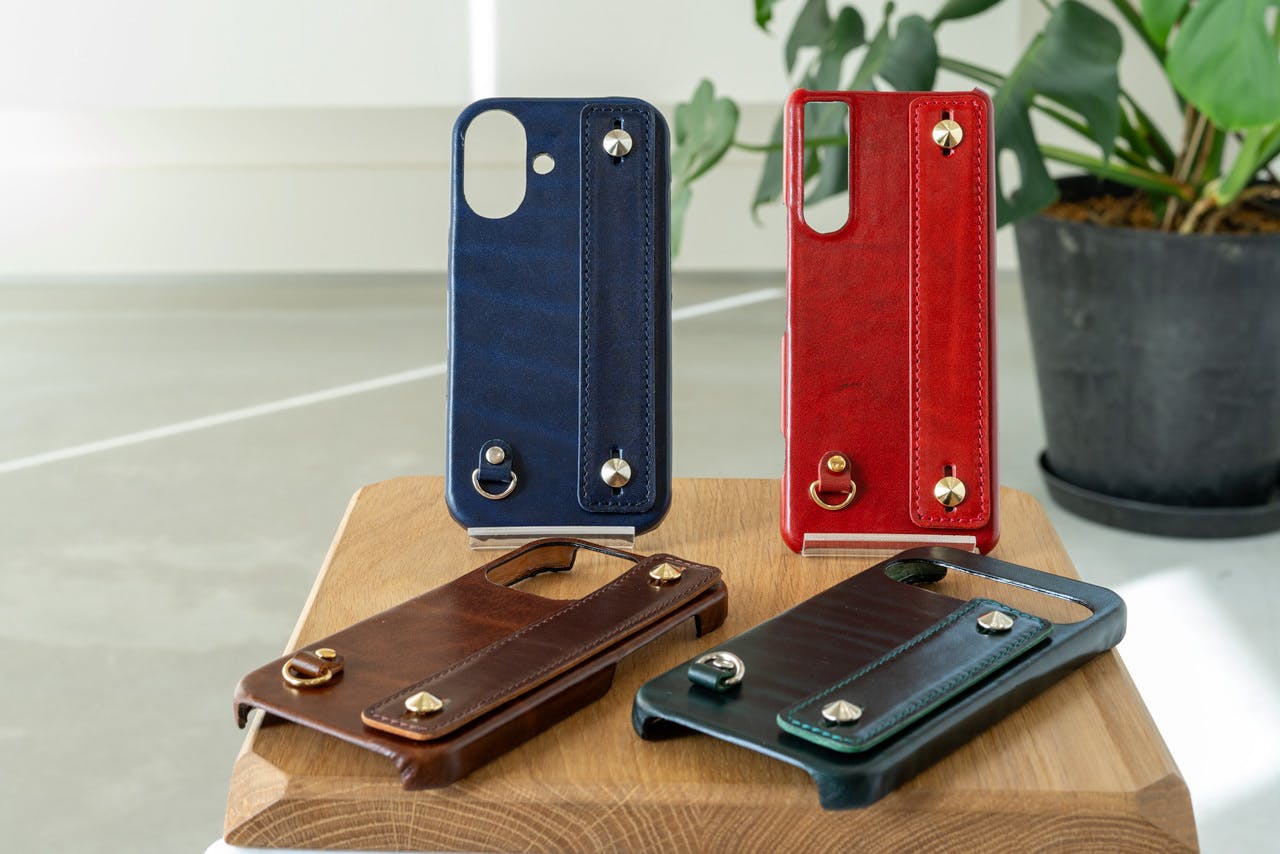 仕様:ポリカーボネート製のクリアケースに0.6mmと極薄に漉いた革を、強力な接着剤を使い圧着して作るカバータイプのスマホケースです。免許証やクレジットカードを収納できるポケット、幅広の落下防止ベルトが特徴。ベルトをとめる金具はラウンドのピラミッド型のカシメを使用しています。