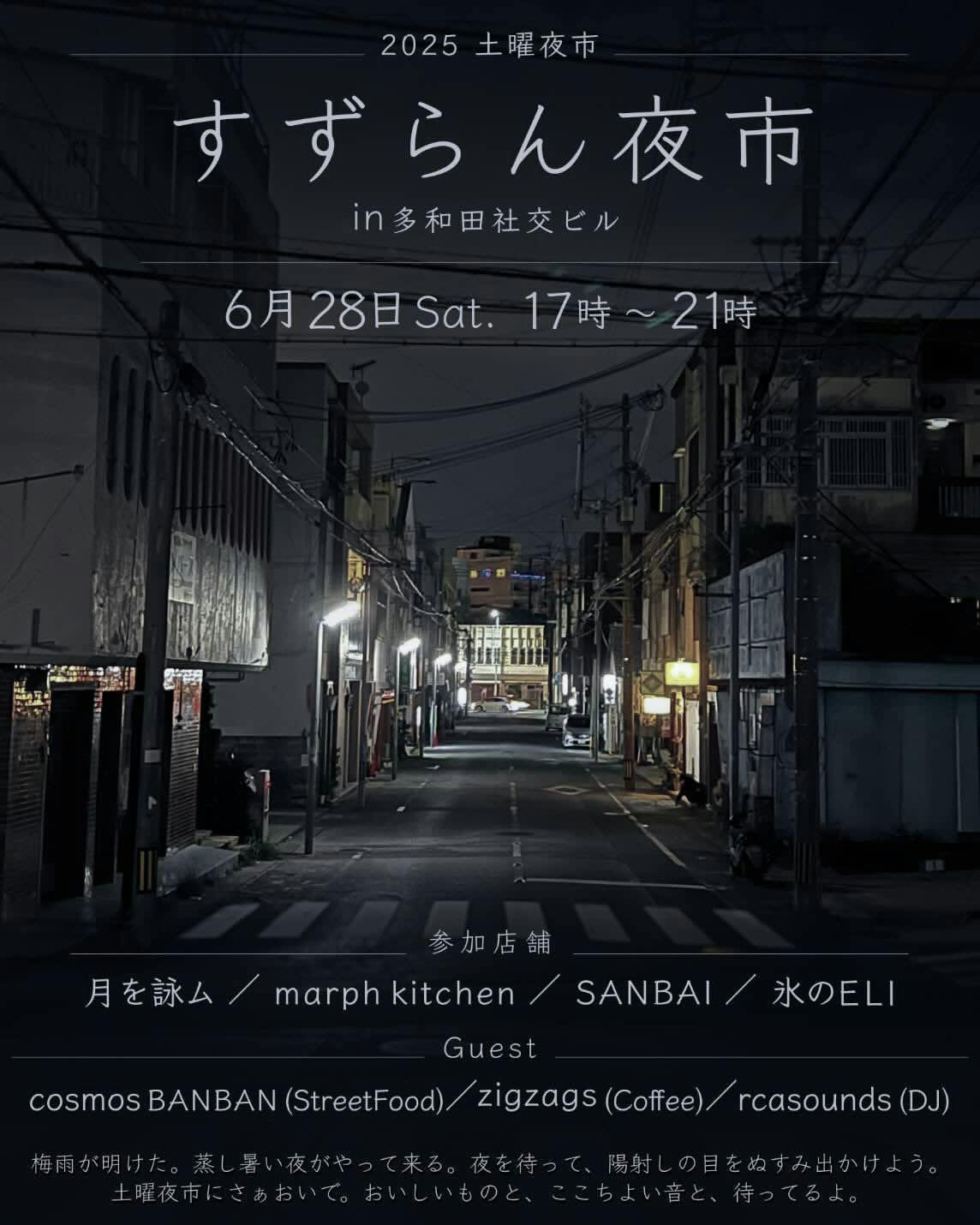 すずらん通りにある多和田社交ビルでひらかれる夜市で、すずらん通りの飲食店の皆さんを中心に美味しいものが大集結しちゃいます。zigzagsは明日はエスプレッソ(コーヒー)ではなく、クリーミーオレンジアイスコーヒーと抹茶ラテの2種類を提供します!食後のデザートドリンクとして、お楽しみください⭐︎