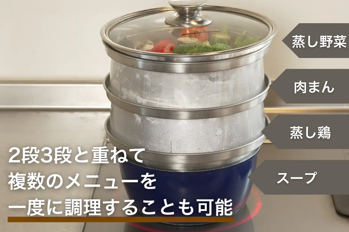 2段・3段と重ねて使えるから、ごはんもおかずもおやつも一度に調理が可能。