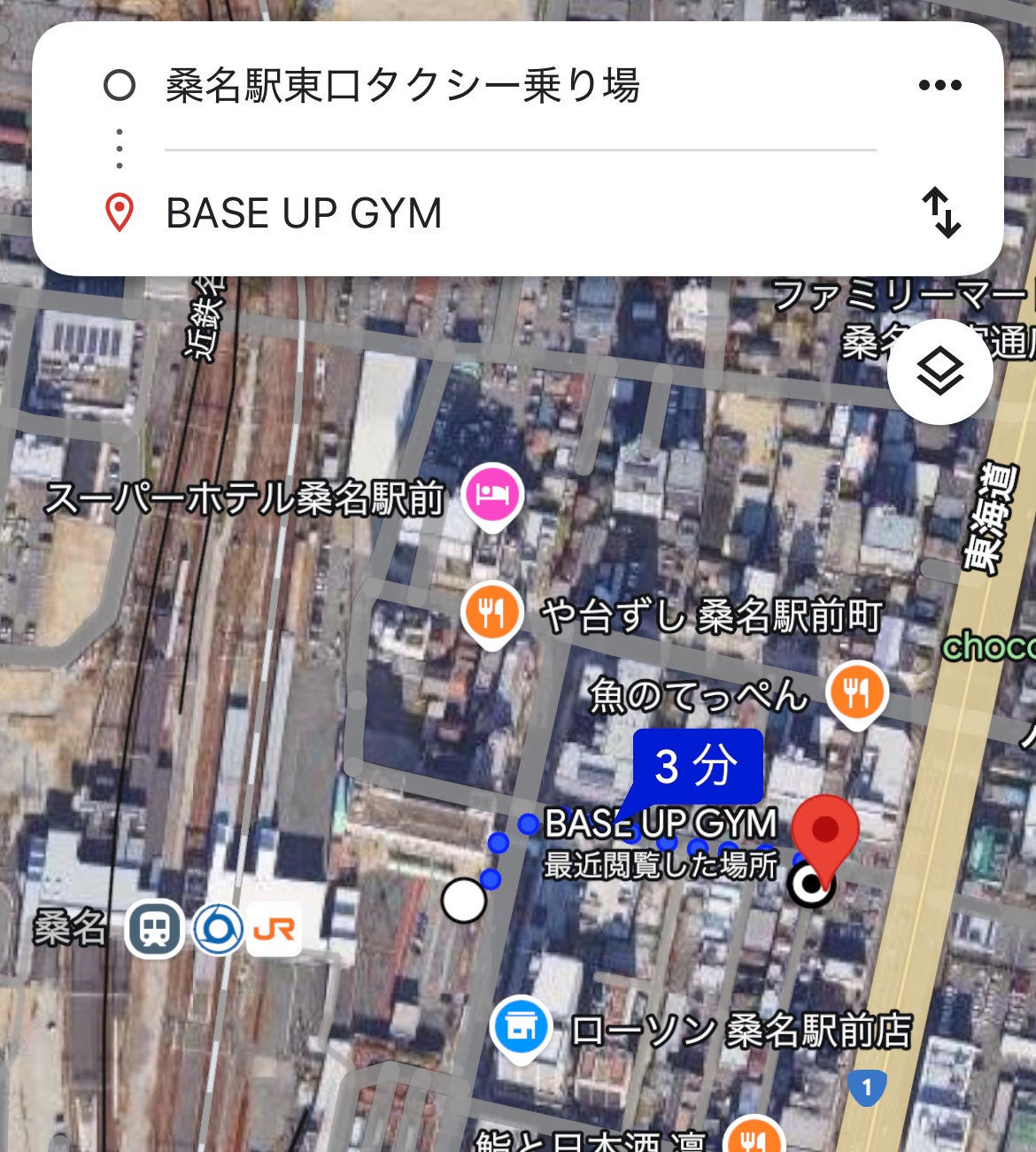 ジムの場所はJR・近鉄桑名駅から徒歩3分にあり国道1号沿線にあります。