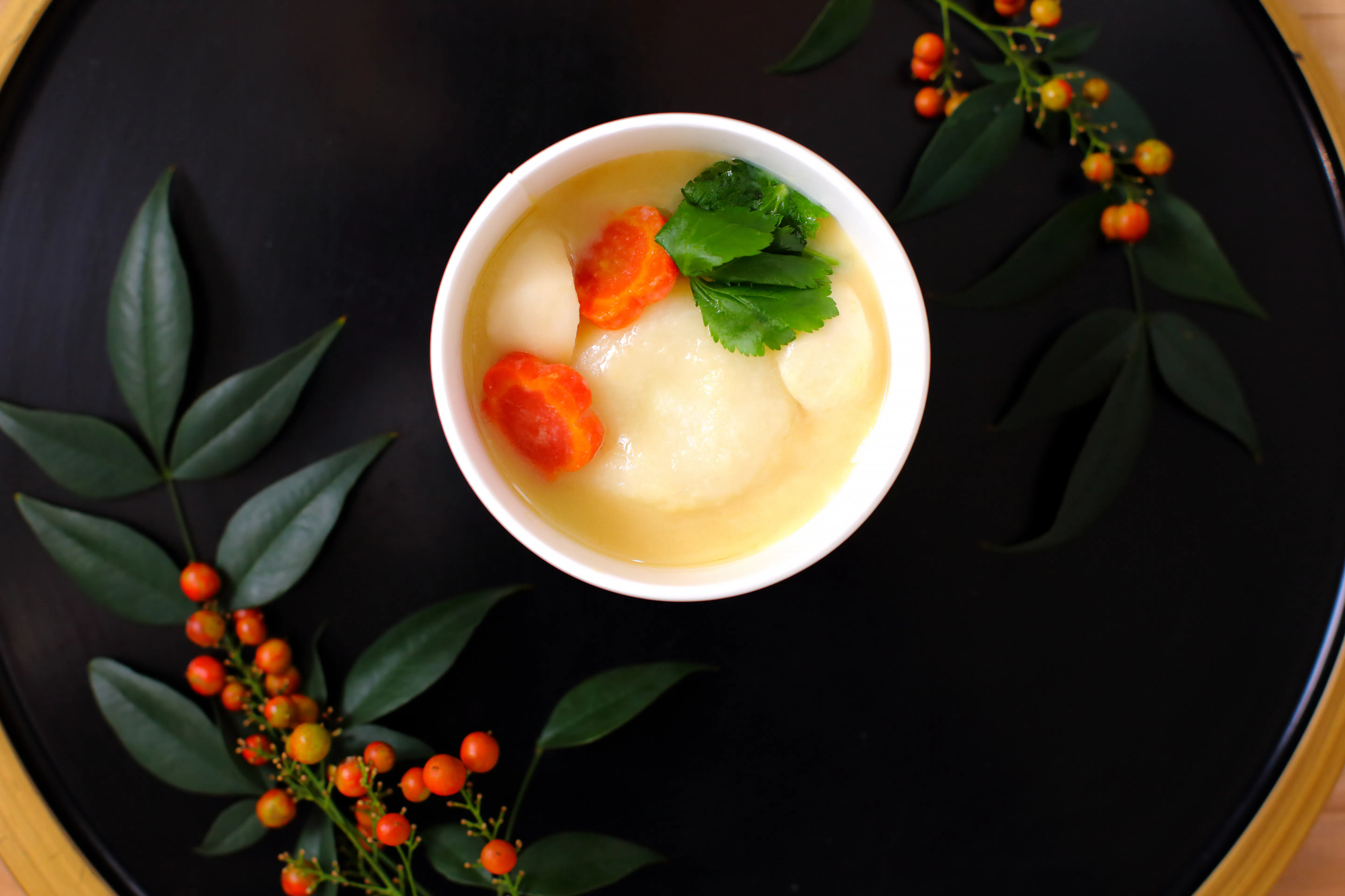 2つ目は京都四条の料理屋てら戸とのコラボ商品。和食の店ながらカレーのつけ麺が人気です。それを元にカレースープ3種(里芋とチーズのカレースープ・丹波産地鶏と山椒カレースープ・京都産ハバネロのカレースープ)を作りました。また、同じくてら戸さん監修の雑煮の新たな商品として「生姜香る白餅のけんちん雑煮」も作りました。京都の白みそとはまた違ったすまし汁に具材が沢山入ったお雑煮になっています。