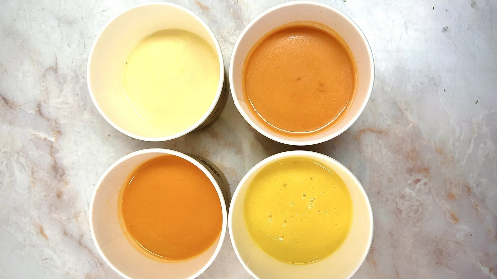 (原材料) ①とうもろこし: とうもろこし、とうもろこしピュレ、水、牛乳、生クリーム、蜂蜜、塩、胡椒、ガラスープ ②京人参: 京人参、牛乳、水、生クリーム、上白糖、塩 ③紅はるかの濃厚ポタージュ :さつまいも、水、牛乳、生クリーム、上白糖、塩 ④トマトのガスパチョ トマト、きゅうり、玉ねぎ、ピーマン、にんにく、バケット、オリーブオイル、白ワインビネガー、塩