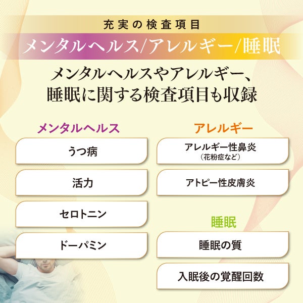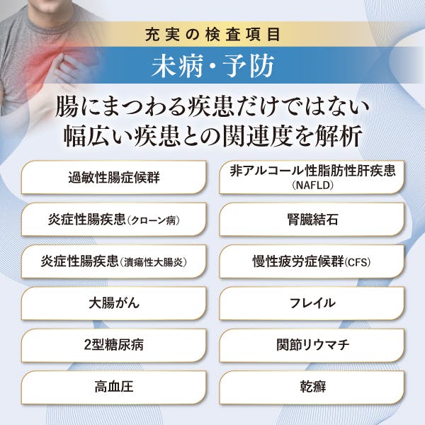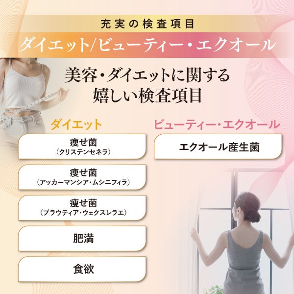 その上で、解析された腸内環境のデータが、あなたの健康状態や体質にどのように関連しているかを多角的に評価・分析します。ダイエット・メンタルヘルス・アレルギー・睡眠・疾患などに関するレポートや、ビタミン・短鎖脂肪酸などの栄養素を産生する菌の存在や女性の美に関係するエクオール産生菌の存在などを知ることが出来ます。