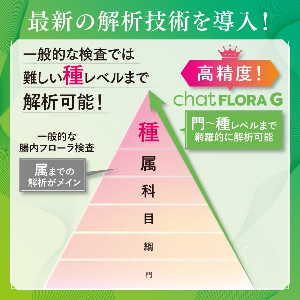 私たちが新たに開発した腸内フローラ検査「chatFLORA G 」は、最新である第三世代の解析技術を用いることで、従来の手法では難しかった、”種”レベルの腸内細菌まで網羅的に把握し、従来は見逃されがちだったレアな菌なども高精度で明らかにします。この技術により、自分の腸内環境を正しく知ることが可能になります。