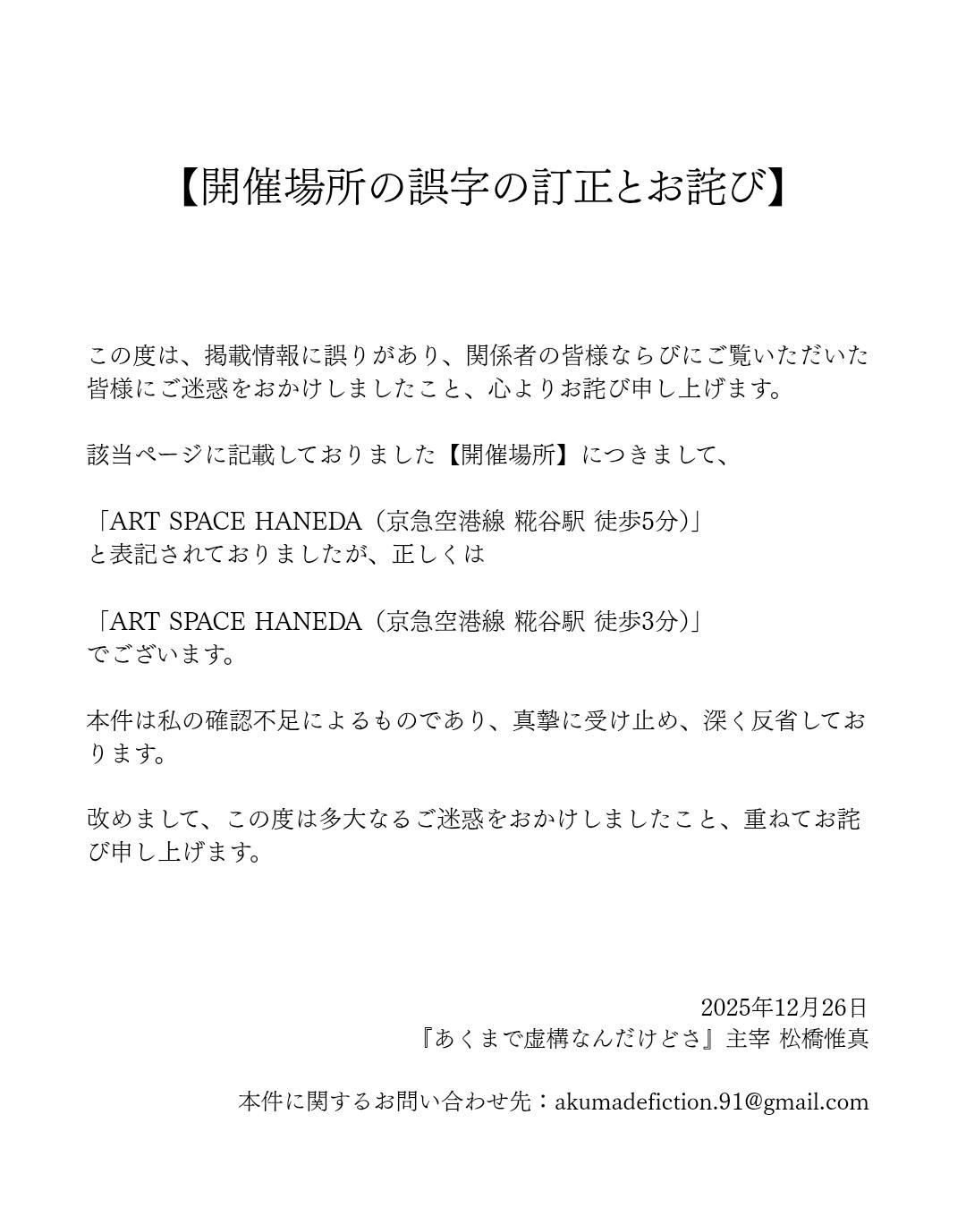『あくまで虚構なんだけどさ。』は、美術・音楽・演劇を横断した体験型展示会です。2025年12月23日〜29日、京急空港線糀谷駅の ART SPACE HANEDA にて開催します。