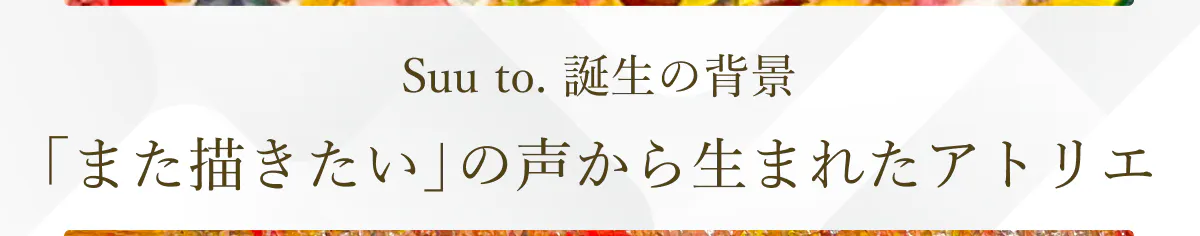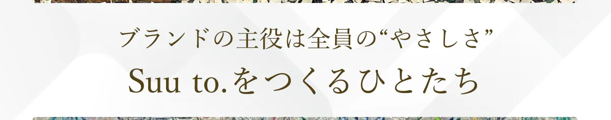 ブランド名「Suu to.」は、やさしさに満ちた想いの循環をイメージして名づけました。誰かの想いを、すうっと吸い込み、かたちにする。それを見た誰かがまた何かを感じ、想いが生まれ、次のかたちへとつながっていく。そんな想いの連鎖が絶え間なく続くブランドでありたいという願いを込めています。