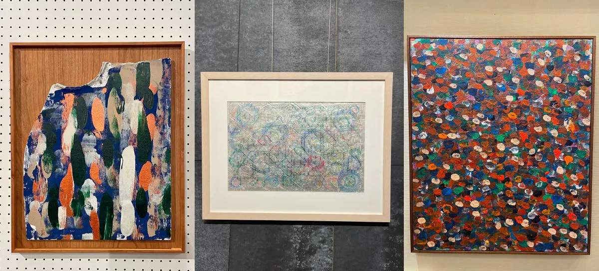 彼女の特徴は描いているうちに次のイメージが湧いてきてしまうこと。鮮やかな色彩の狭間にこちらには追いつかないほどのスピードで、彼女の思考が織り込まれます。作品につけたタイトルを聞くと、やっと彼女には見えていた景色が見え始めるのでした。