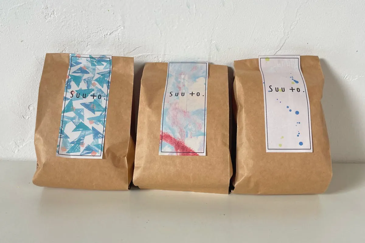 今回リターンのひとつとしてご用意している焙煎コーヒーは、アトリエのすぐ隣にある「みかげ珈琲」とのコラボで生まれた一品です。パッケージにはSuu to.のアートが施されており、味わいだけでなく、視覚でも楽しめるリターンとなっています!