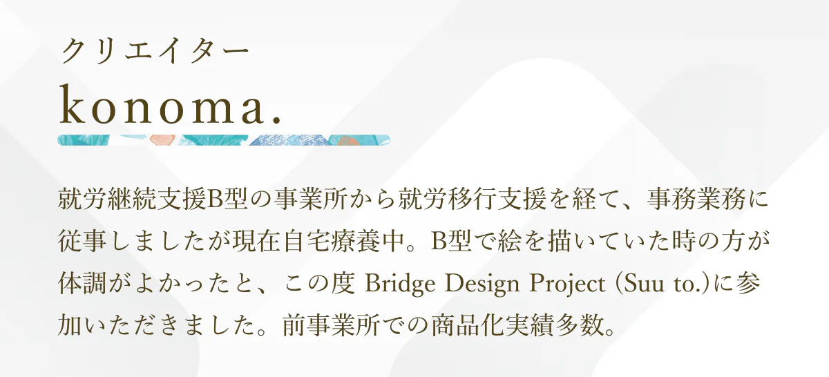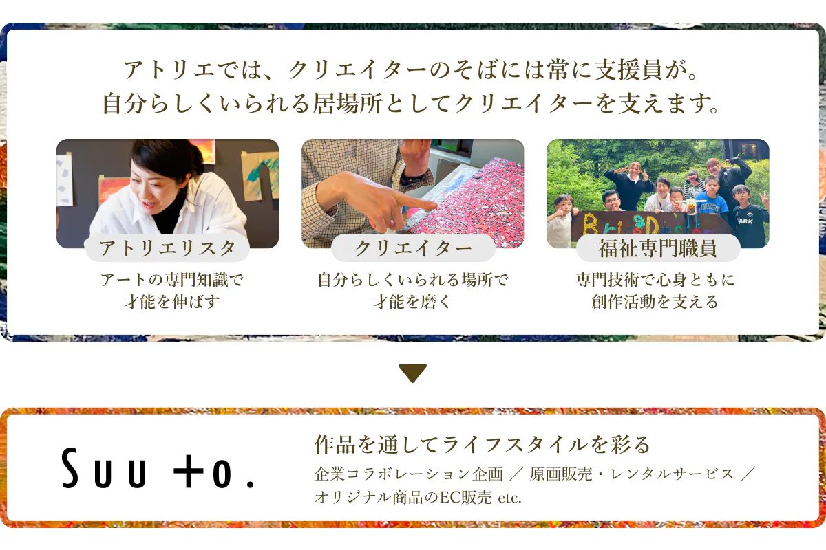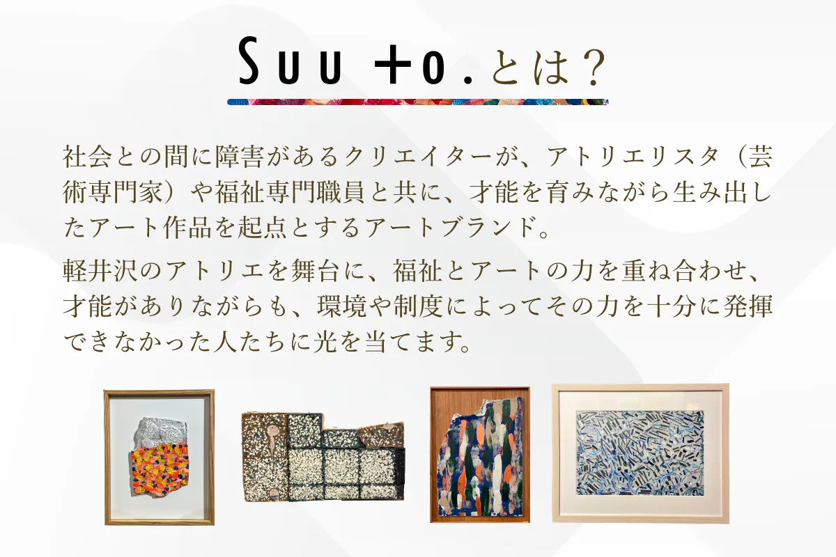 Suu to.(スート)は、障害があるクリエイターが、アトリエリスタ(芸術専門家)や福祉専門職員とともに、才能を育みながら作品を生み出すアートブランドです。