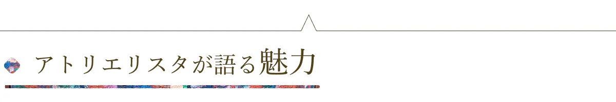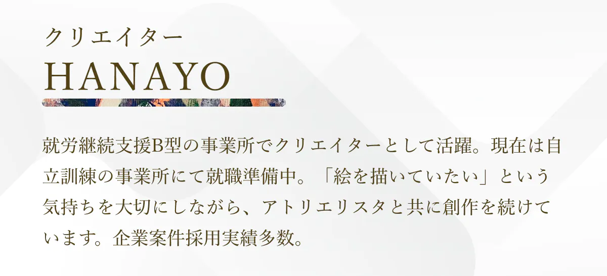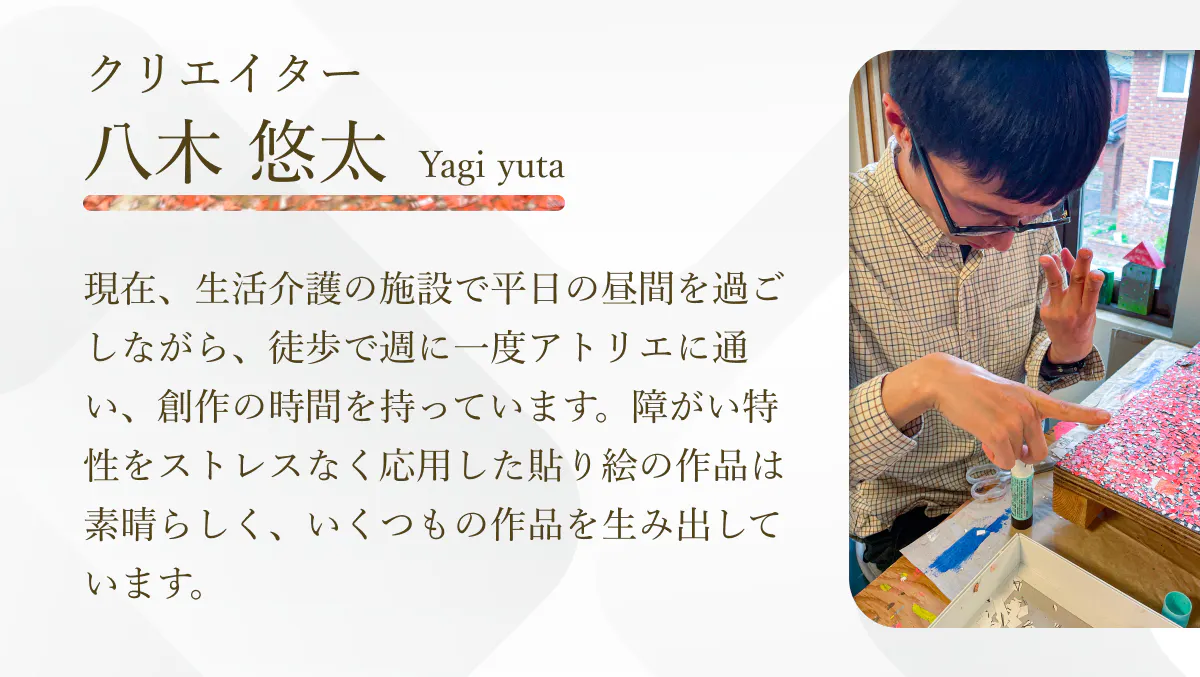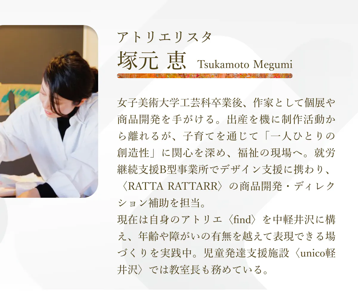 このブランドの原点には、さまざまな障害や環境の制約によって、本来の才能や情熱が発揮されず、社会から遠ざかってしまっている人たちの存在があります。彼らはアトリエに通い、福祉専門職員のケアやアトリエリスタの声がけ・提案を受けながら、支え合う中で作品を生み出します。