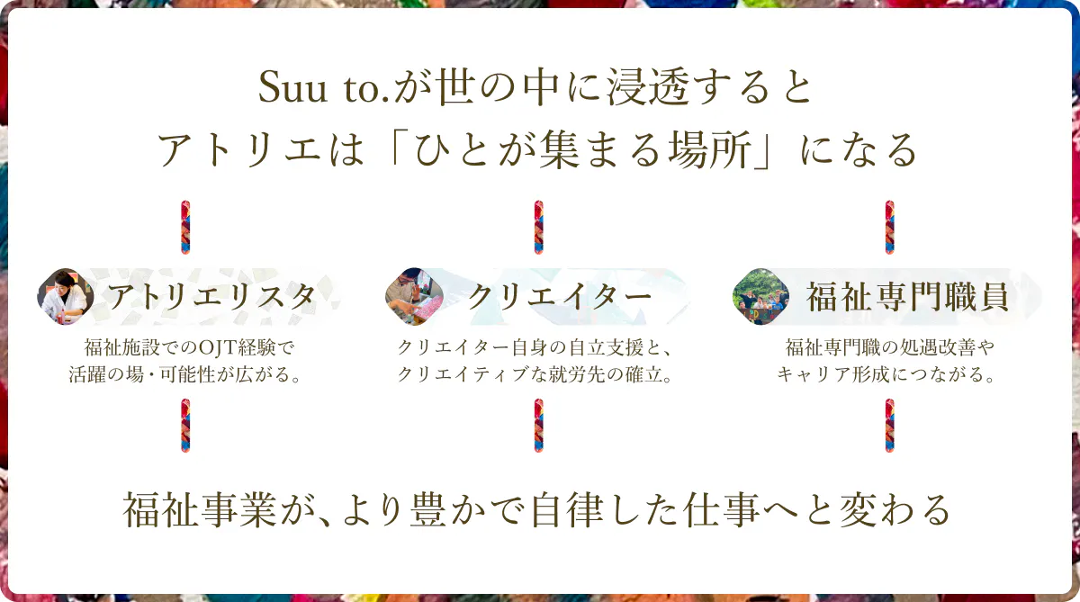 Suu to.が目指すのは、「福祉事業が、豊かで自律した仕事として成り立つ社会」です。クリエイターにはきちんと報酬が支払われ、自律した暮らしが送れるようになる。Suu to.は、アートに情熱を持つ方にとって、クリエイティブな就労先の選択肢のひとつになりえるのです。