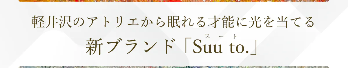 合理性や効率を求めがちな日常のなかで、忘れてしまいそうな感情にふれる。そんな体験がSuu to.にはきっとあります。一人ひとりが、自分の可能性を信じて生きていける、精神的に豊かな社会へ。その実現に向けて、軽井沢のアトリエから始まる小さなやさしさの循環の輪にあなたも加わっていただけたら嬉しいです。