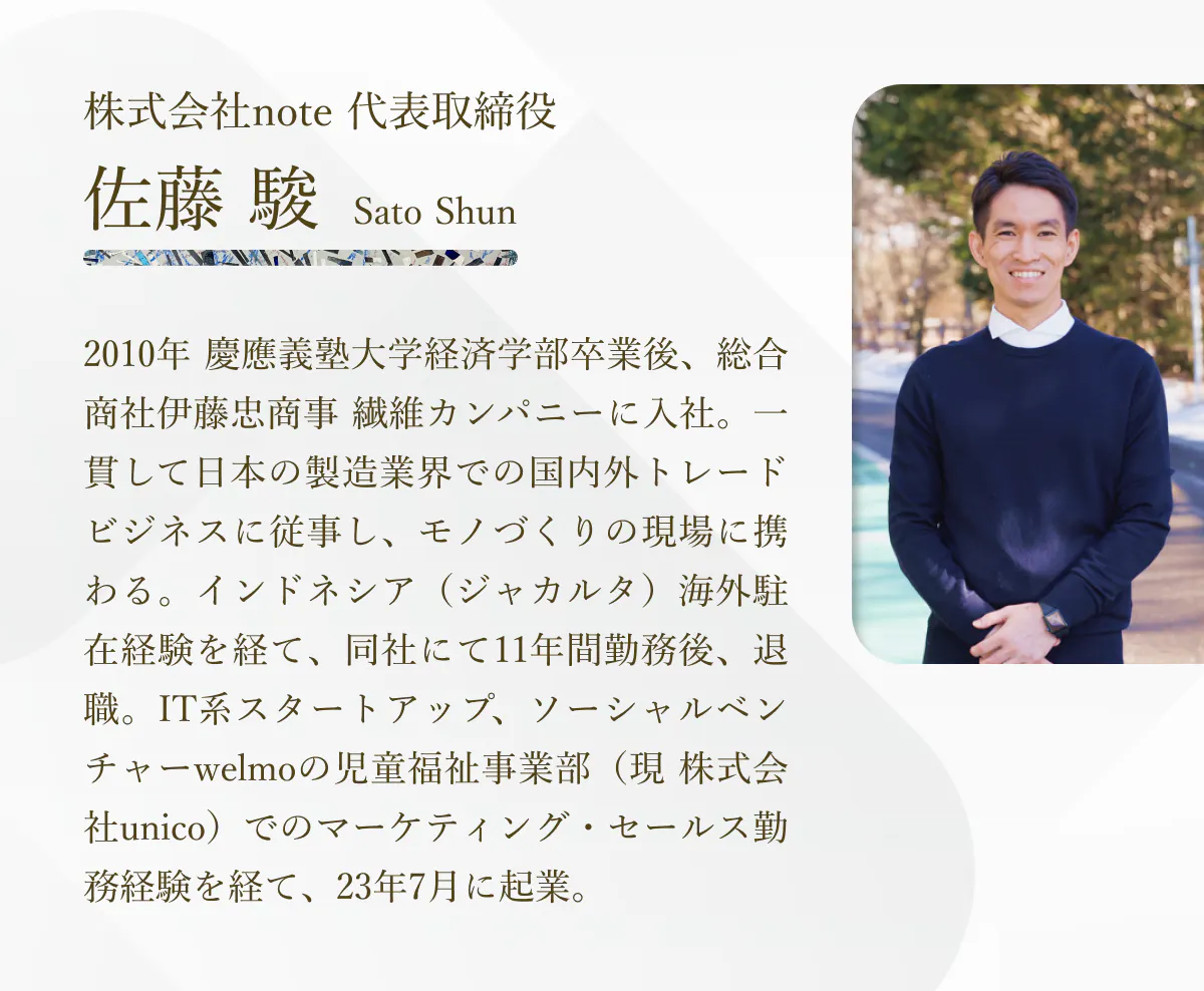 この度は本プロジェクトにご関心をお寄せいただき、ありがとうございます。株式会社note代表取締役の佐藤駿と申します。私たちは長野県・軽井沢を拠点に、子どもの発達支援を中心とした福祉事業を行っています。「ライフスタイルを自由に描ける社会の実現」をミッションに掲げ、誰もが自分らしく生きる選択ができる社会を目指して日々活動しています。