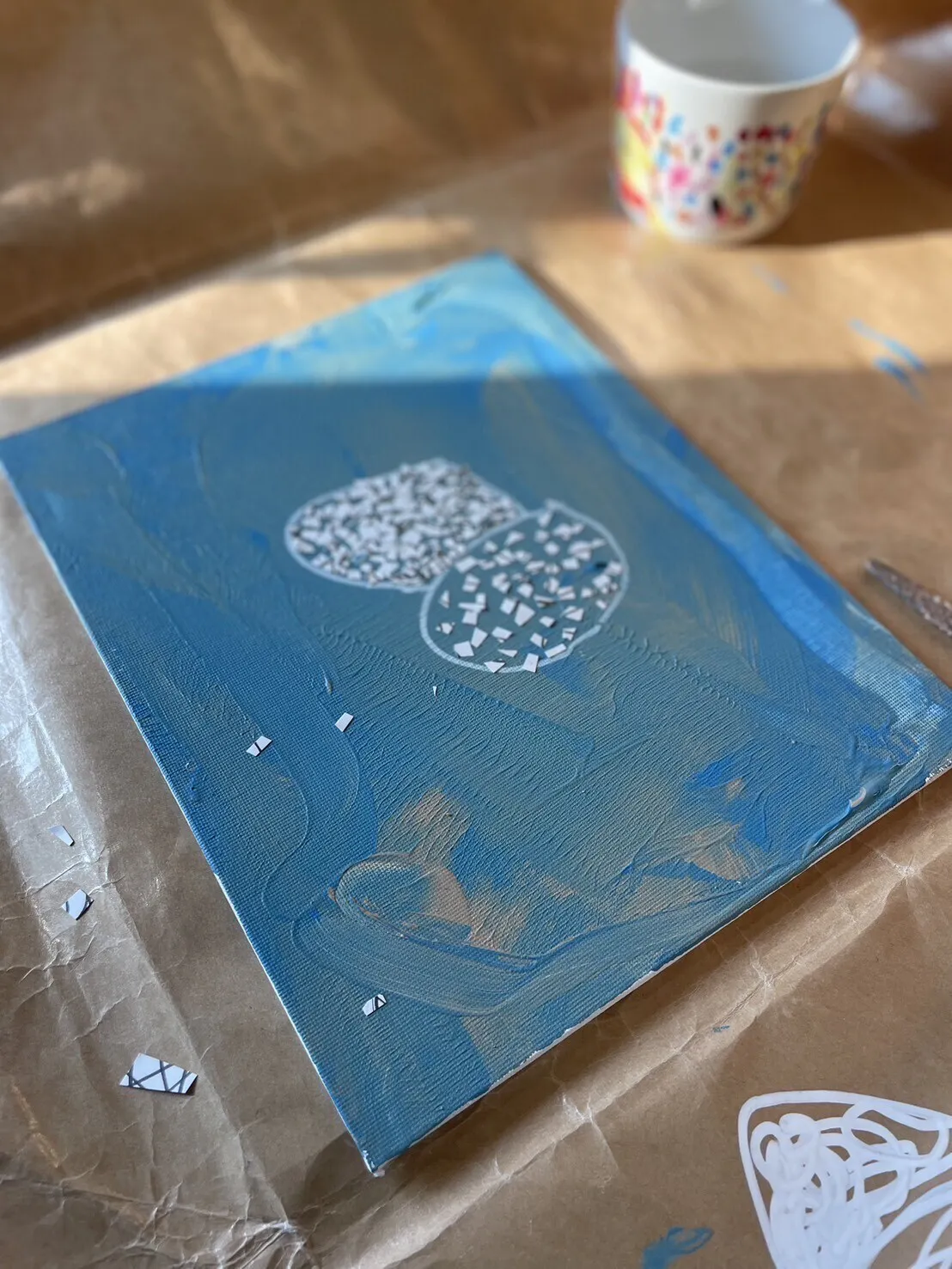 貼り絵名人の八木さん。描いた紙を細かく切って、キャンバスにまぶしていく。