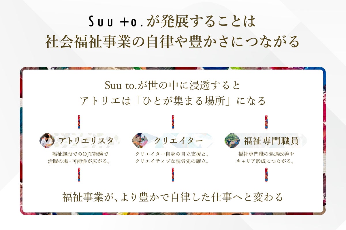 社会との間に障害があるクリエイターが、芸術の専門家や福祉専門職員と共に作品を生み出すアートブランド「Suu to.」。軽井沢のアトリエを拠点に、障害や制約により社会から遠ざかってしまった才能に光を当て、より豊かで、より自律した福祉事業の実現を目指します。