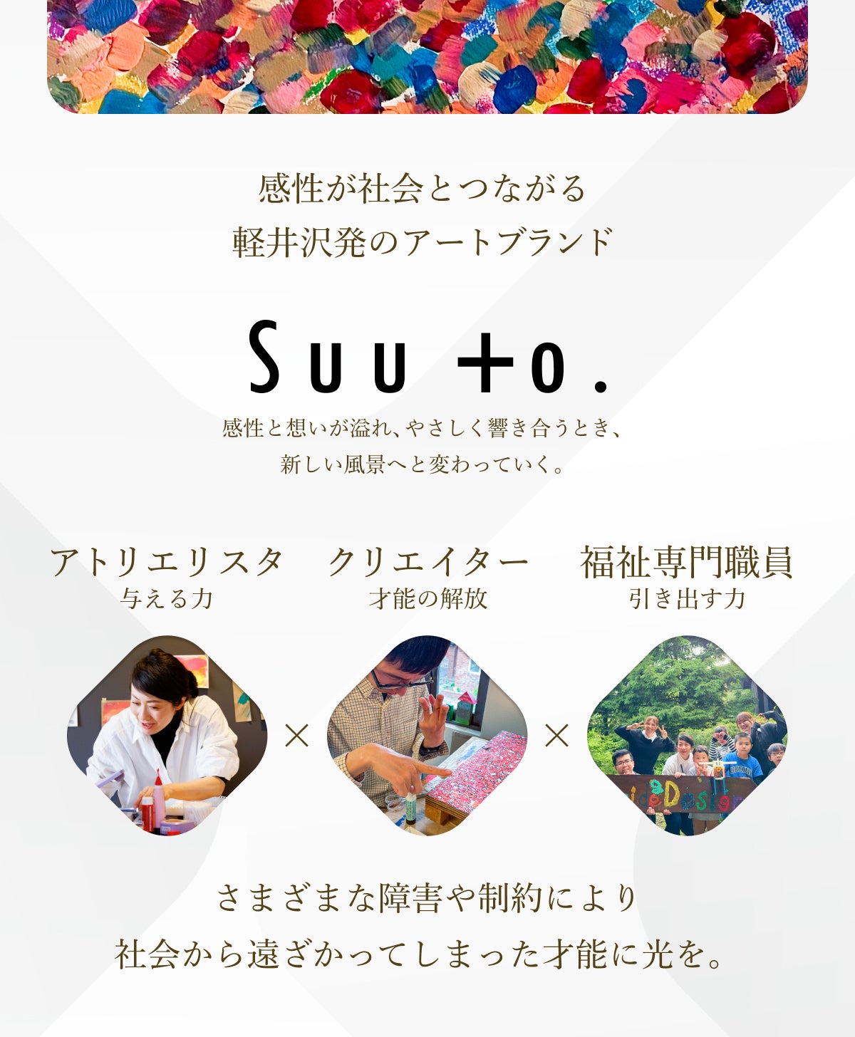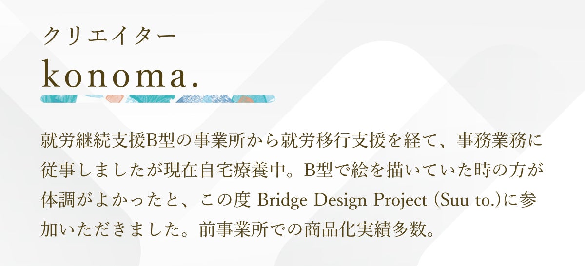 Suu to.(スート)は、障害があるクリエイターが、アトリエリスタ(芸術専門家)や福祉専門職員とともに、才能を育みながら作品を生み出すアートブランドです。
