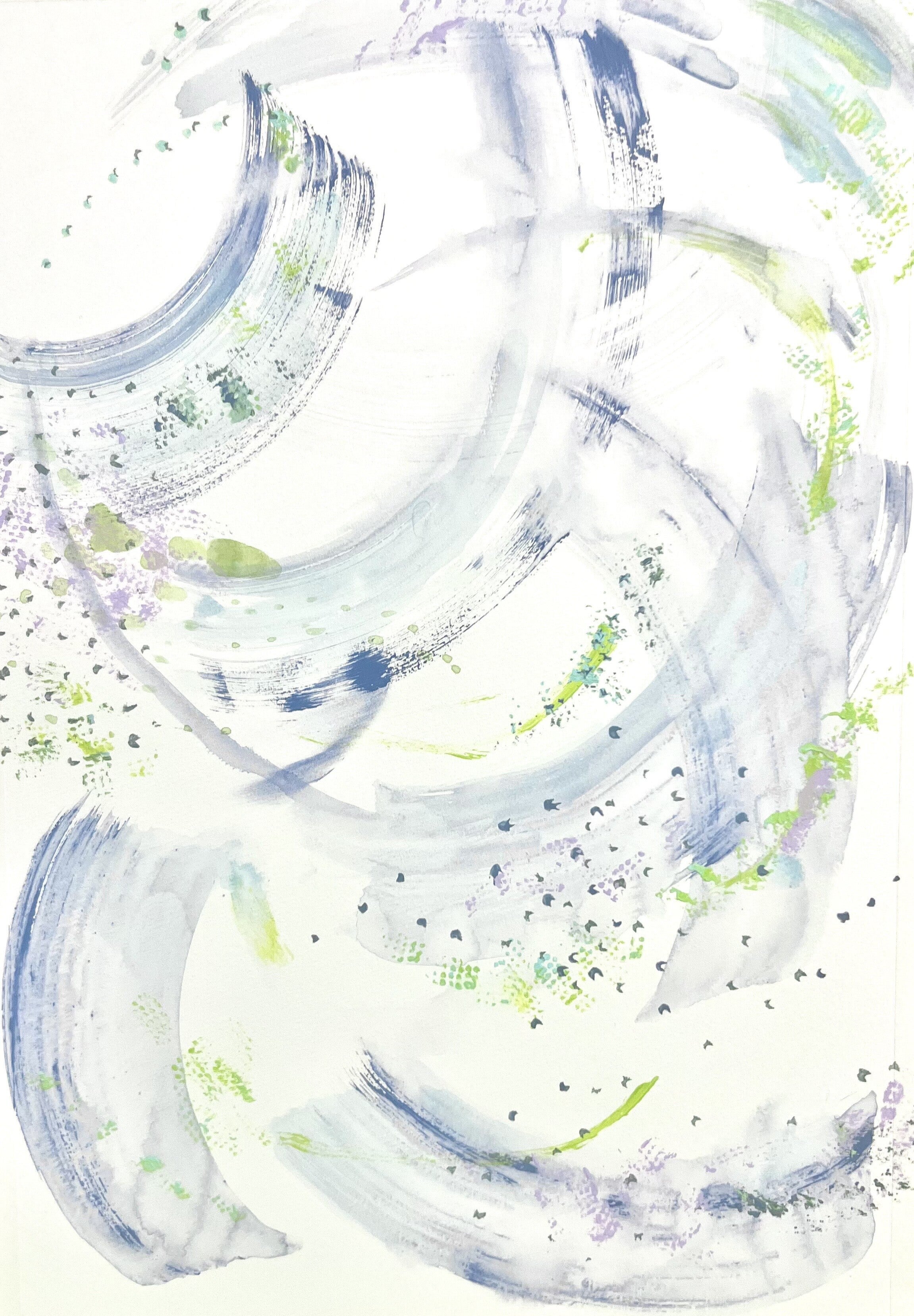彼女の特徴は描いているうちに次のイメージが湧いてきてしまうこと。鮮やかな色彩の狭間にこちらには追いつかないほどのスピードで、彼女の思考が織り込まれます。作品につけたタイトルを聞くと、やっと彼女には見えていた景色が見え始めるのでした。