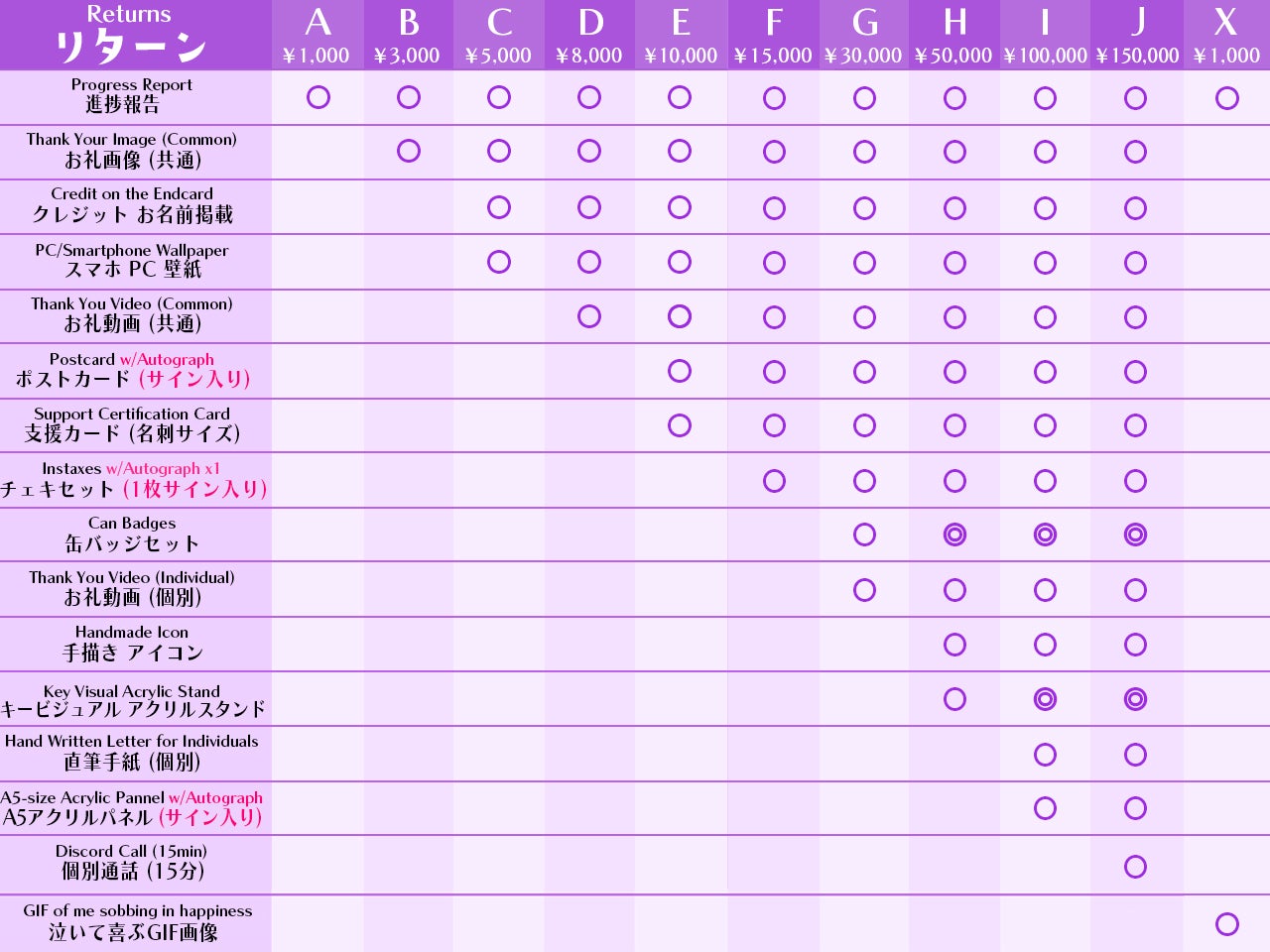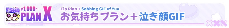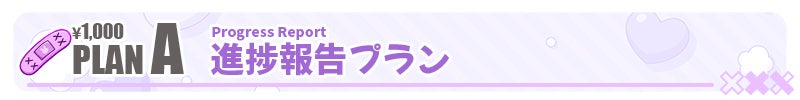 💜【PLAN X】は1000円から入ることのできるプランで、活動報告とGIF画像のセットプランになっております。リターン選択画面では進捗報告がつかないと記載しておりますが、実際には閲覧可能です。こちらの不手際によりご迷惑をおかけしてしまい、申し訳ございません…(2025/6/3 追記)