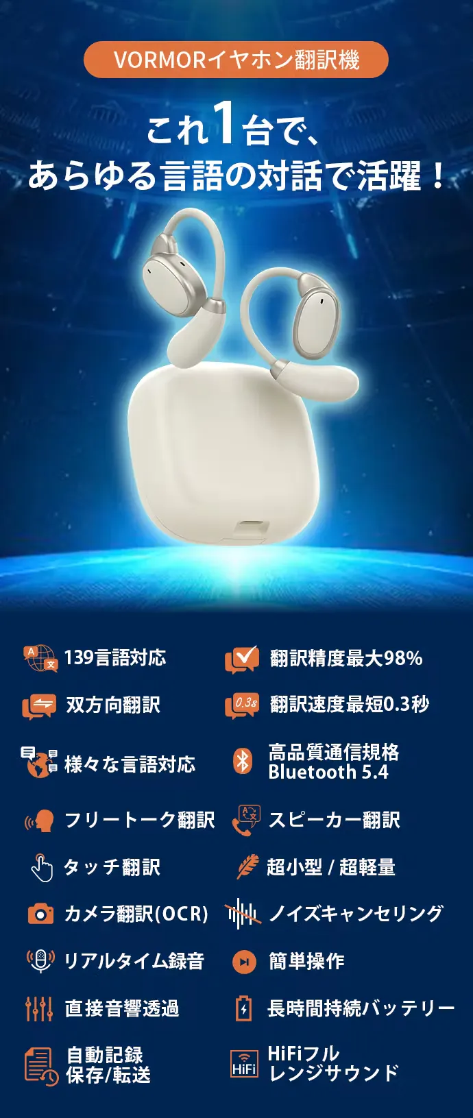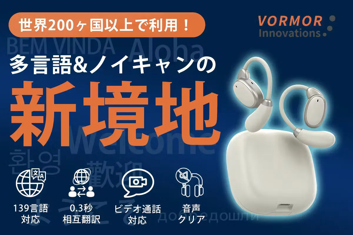 今回の新商品VORMOR V13は、耳に装着するだけで会話相手の世界139言語の壁を瞬時に超えることができて、リアルタイムに会話を楽しめるイヤホン型翻訳機です。