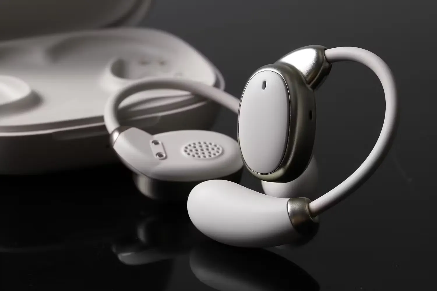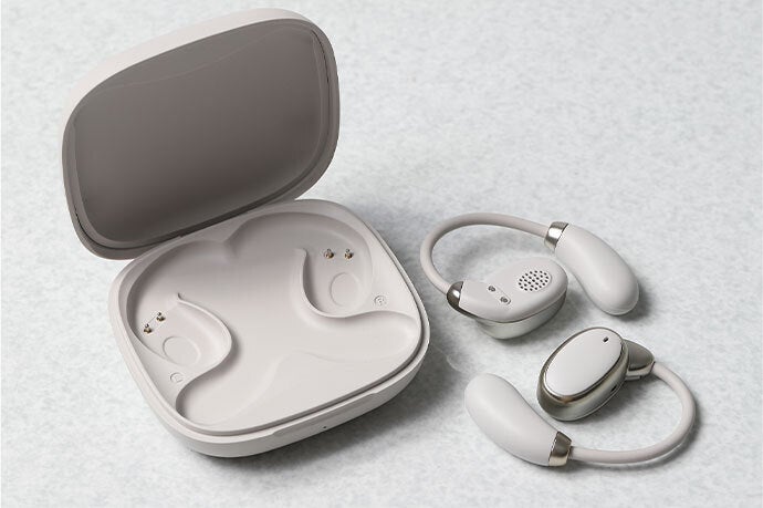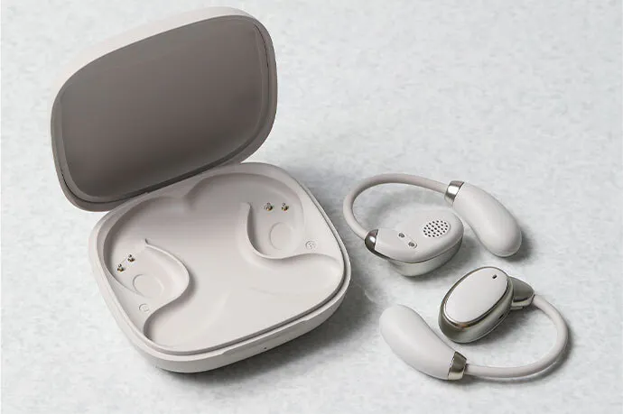物理的に耳の中にイヤホンを入れないデザインのため、従来のカナル型イヤホンのような耳の中の蒸れの軽減、そして、圧迫による物理的な耳への負担を軽減しています。