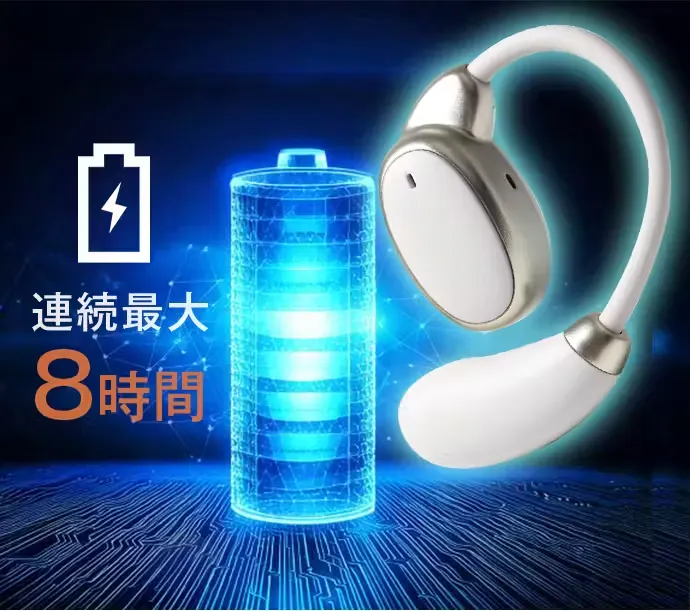 イヤホン型のVORMOR V13は、軽量化を図るため50mAhの小型バッテリーしか搭載していませんが、メーカー独自の省エネ設計により、フル充電で最大8時間も使えます。