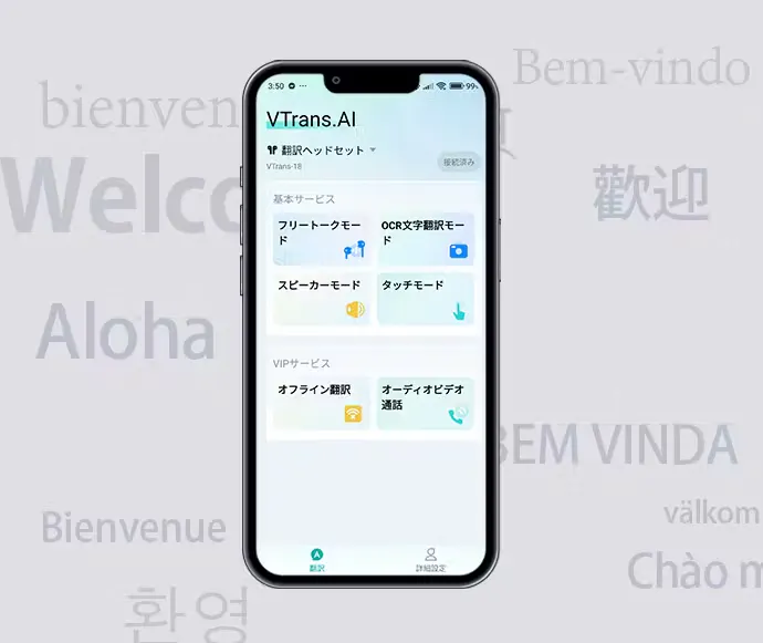 スマホで専用アプリをダウンロードし、仮想空間上のAI翻訳機能とイヤホンを連携することで、最大98%の翻訳精度で自動翻訳が可能。
