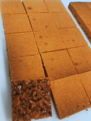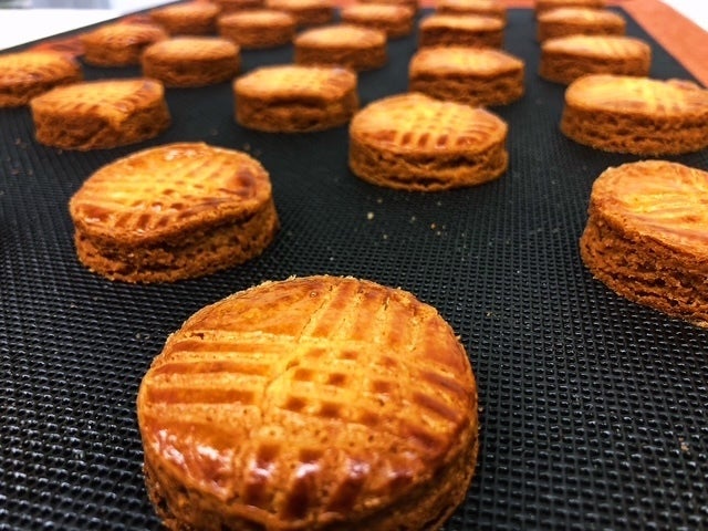 →薪型クッキーの中にキャラメルりんごジャムとマカダミアナッツ入りのキャラメル