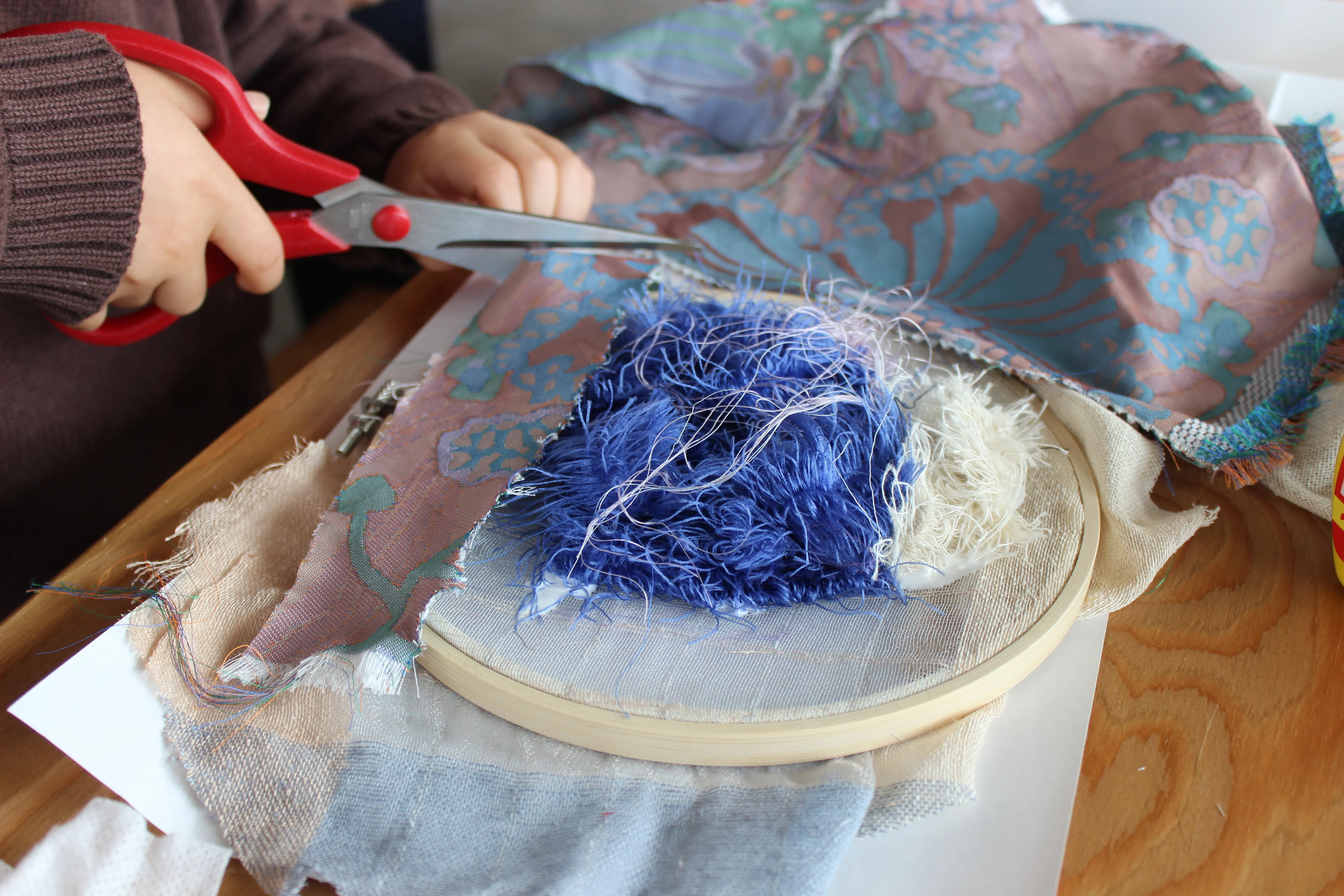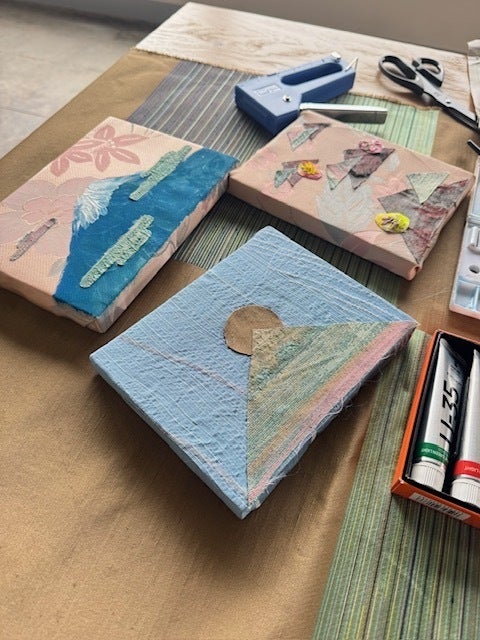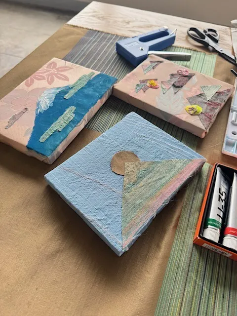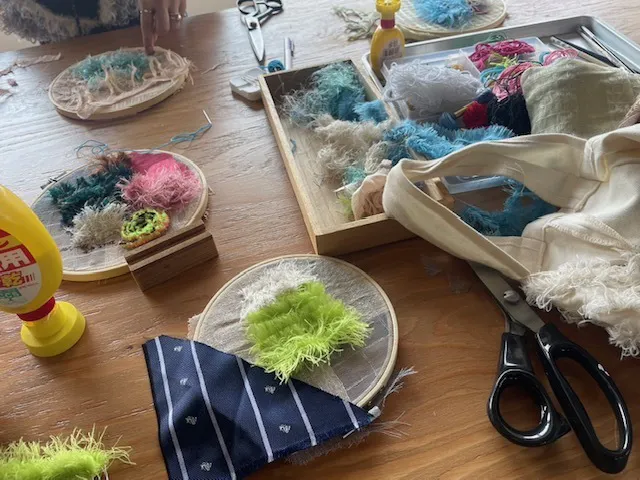 たとえば、機織り生地を使って富士山を表現するコラージュ制作や、本来は捨てられてしまう「捨て耳」と呼ばれる織物の端材を使い、それぞれの“私だけの富士山”をつくる体験も行いました。
