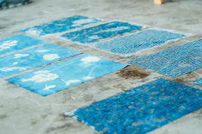 この企画では、富士吉田にゆかりのある子どもたちと一緒に、木の実や葉っぱ、大切なぬいぐるみなどを使って、青写真を制作するワークショップを開催しました。