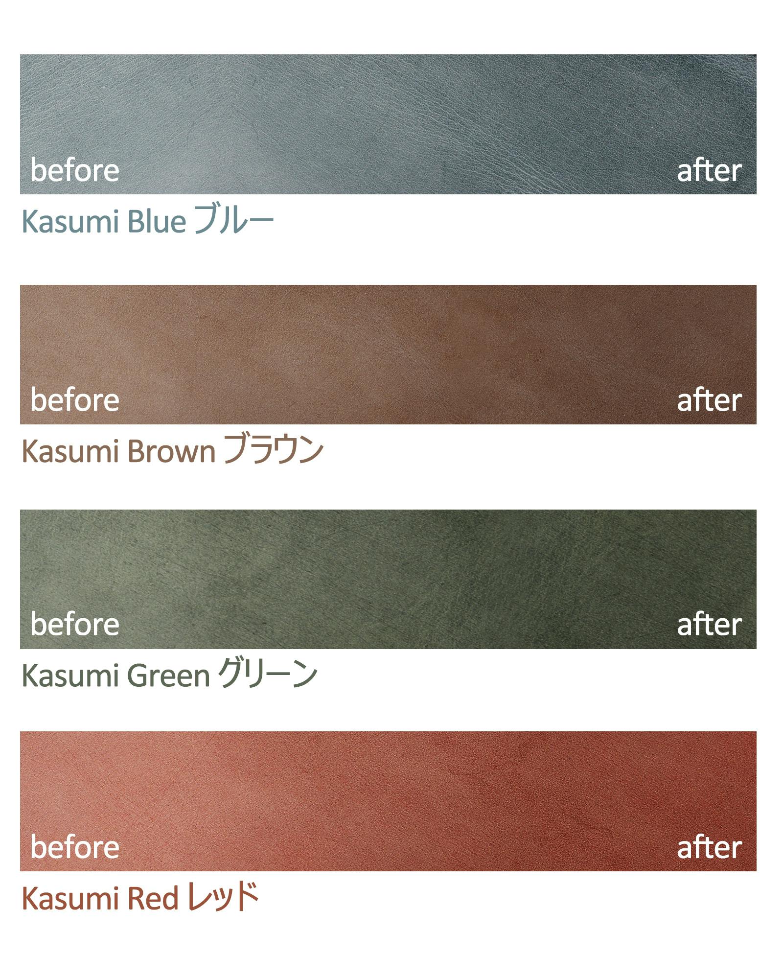 今回、革イズムシリーズの「KASUMI」は、姫路のタンナーが通常の革工程よりも手間暇をかけフルタンニンで鞣(なめ)し、ワックスとオイルをたっぷり染み込ませた革を使用しております。