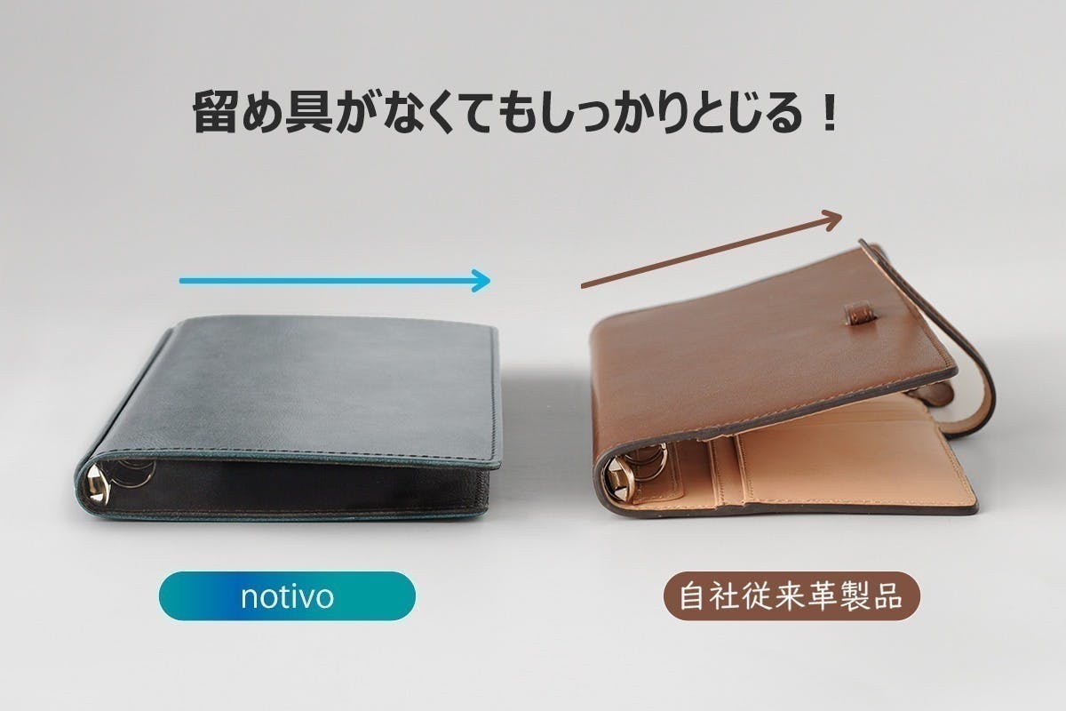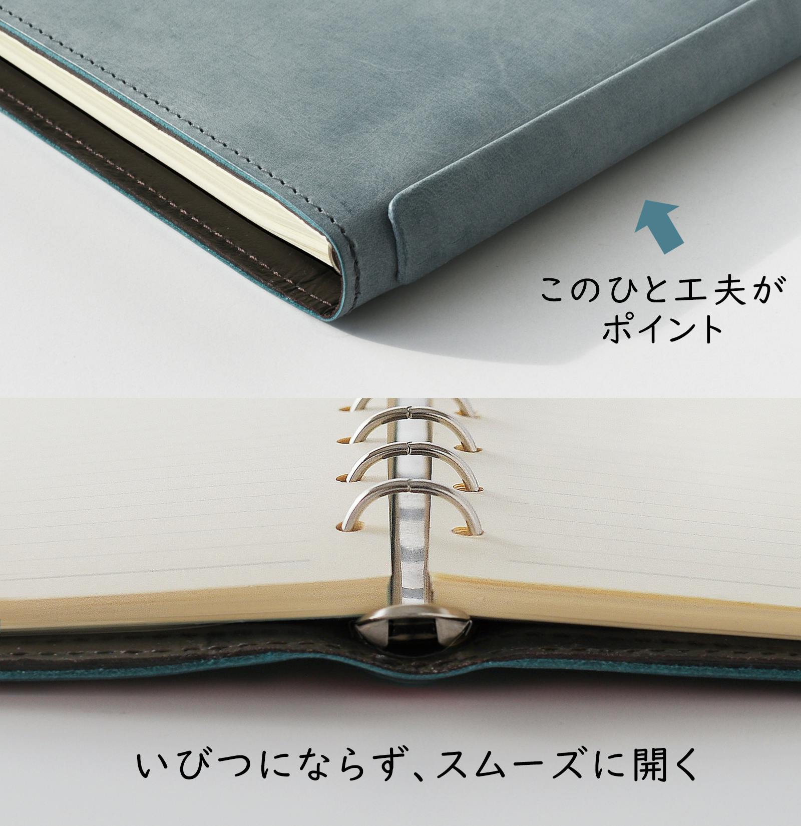 バックプレートとリングで貼り合わせた一枚革を挟む弊社オリジナル構造(意匠登録済)により、完全に開いた状態で使用できるほか、デスクがない環境でも折り返した状態で使用可能です。