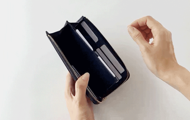 YOSHINAのLZIP長財布は、オリジナル製法によりカードを財布の最下部まで差し込める設計を採用しています。