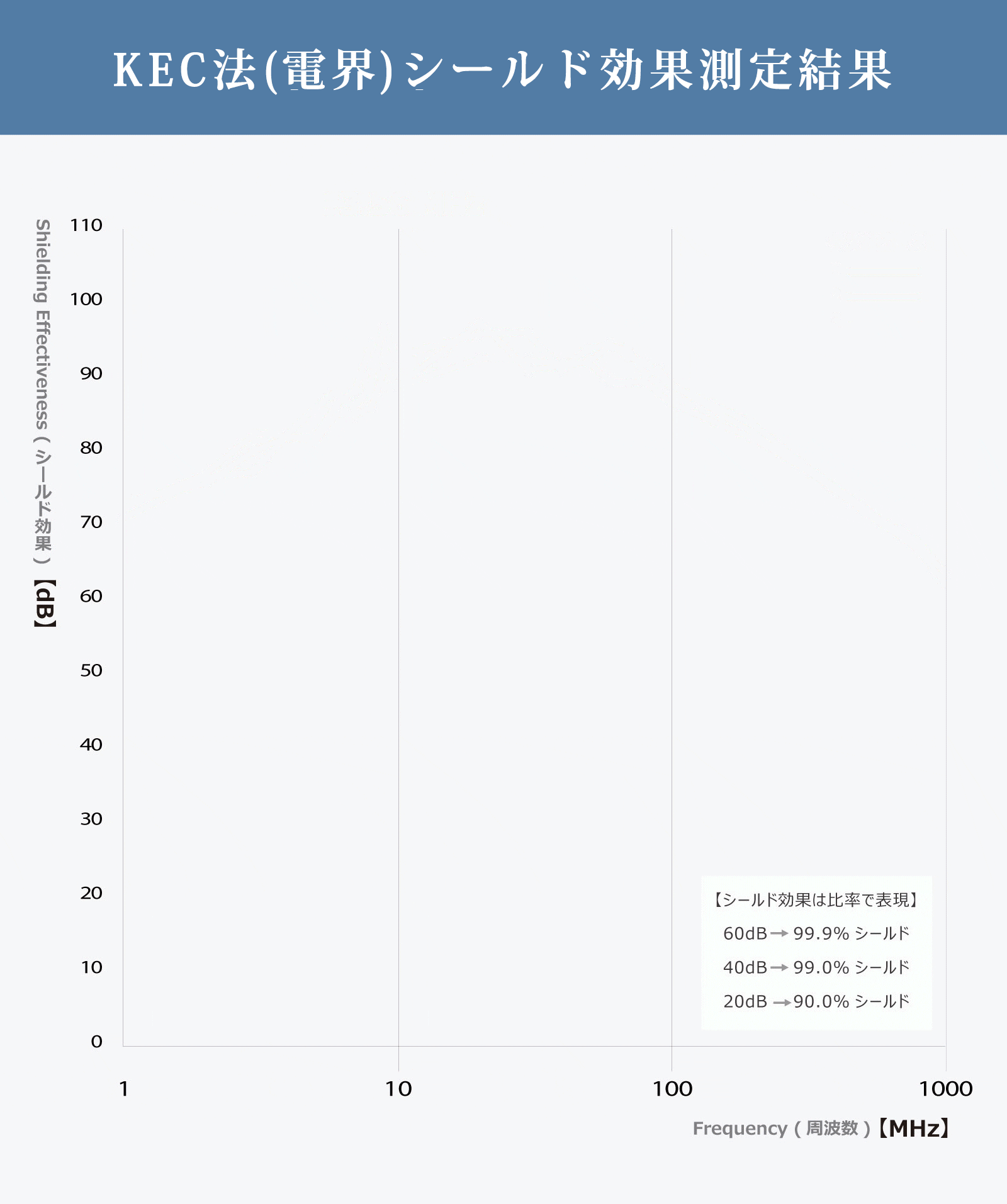 研究センターの測定装置はスキミング防止シート本体のみの測定となります。その結果、「平均以上ゾーン[60dB](99.9%)」のシールド効果が確認されました。しかし、製品本体に組み込んだものは、研究室の測定条件と異なるため、使い方(遮蔽エリアを開いたままなど)によりシールド効果が弱くなる場合がございます。また、スキミング技術も日々向上しているため、本製品が100%遮断できる保証は致しかねますので、あらかじめご了承ください。