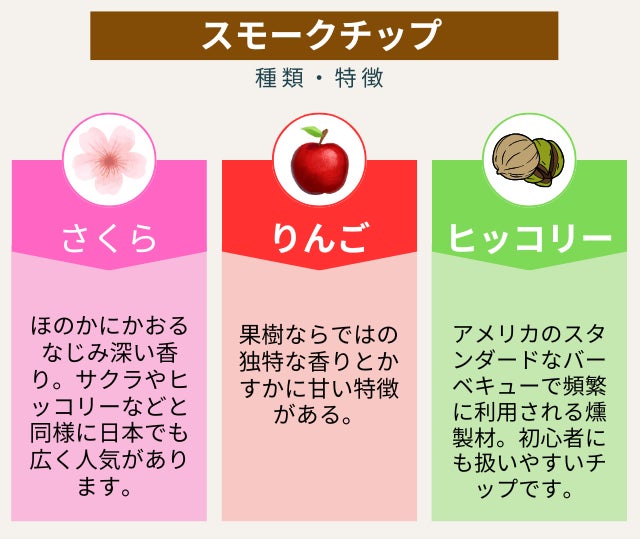 食材とスモークチップのアレンジを変えるだけで、香りや燻した時の色付きが異なります。自分好みのスモークチップを見つけてより美味しい燻製を楽しんでください。