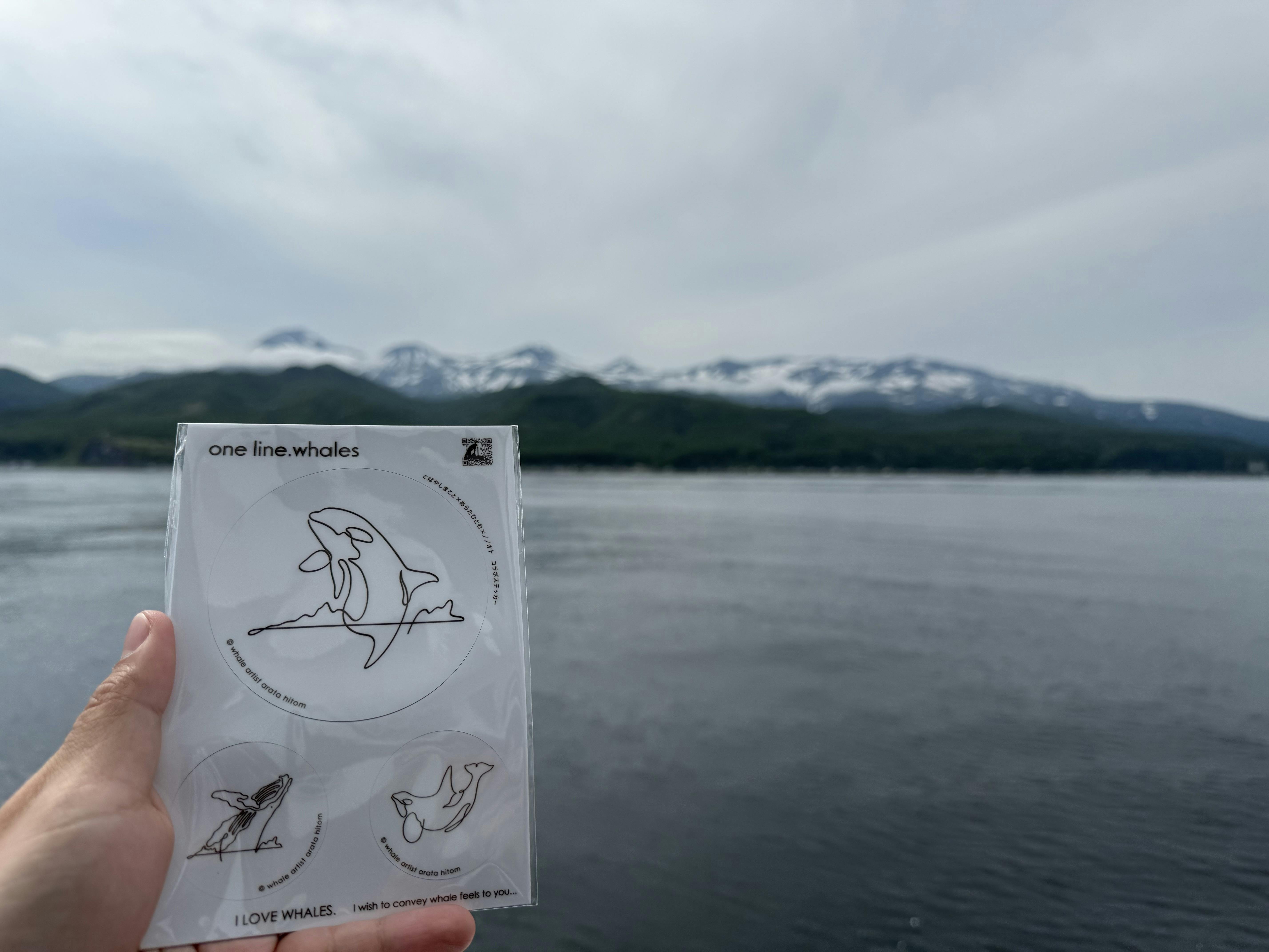 ノノオトの副代表である小林が撮影した子どものシャチのブリーチング。その写真をもとにホエールアーティストとして活躍するあらたひとむ氏が素敵なイラストを描いてくれ、それがステッカーに。モデルとなった1枚と合わせてのセットグッズです。
