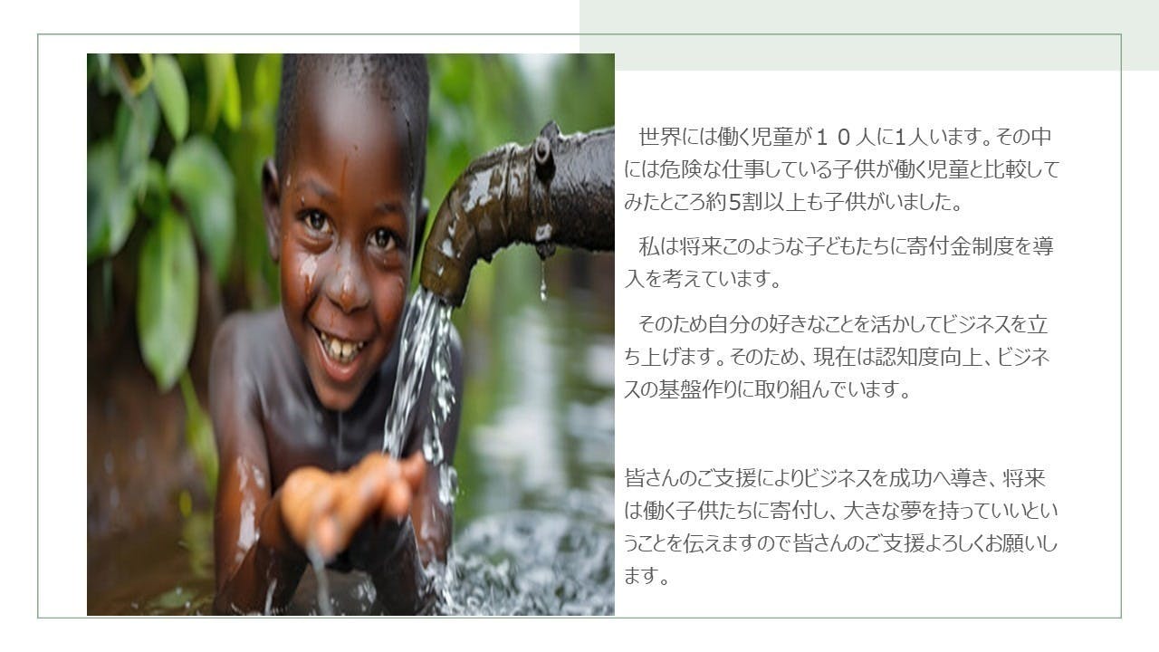 世界には、夢どころか学校に行くことすらできず、生活のために働かなければいけない子供たちがたくさんいます。そんな現実を知って、「自分が何かを届けられる存在になりたい」と強く思うようになりました。