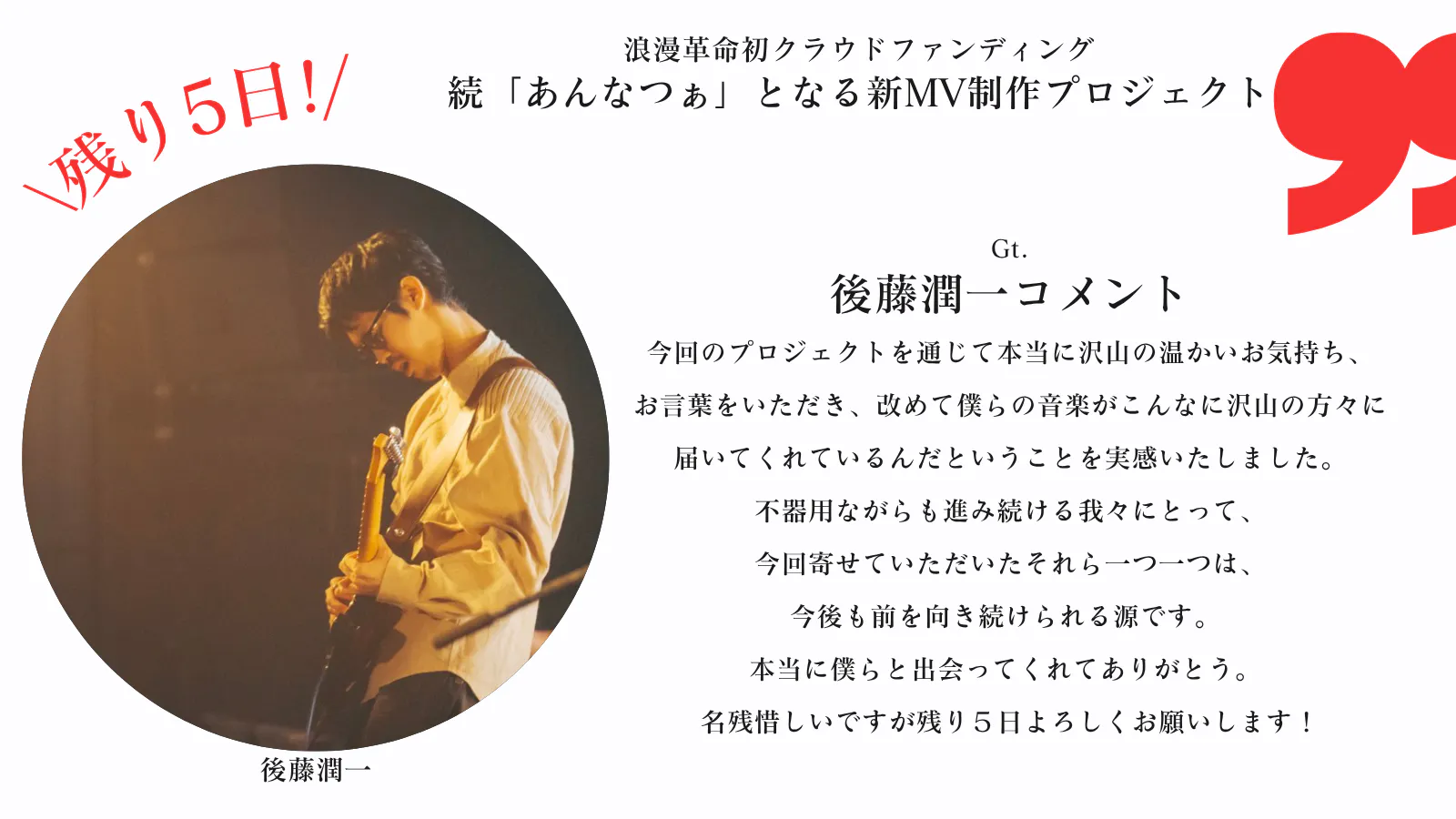 今回のプロジェクトを通じて本当に沢山の温かいお気持ち、お言葉をいただき、改めて僕らの音楽がこんなに沢山の方々に届いてくれているんだということを実感いたしました。