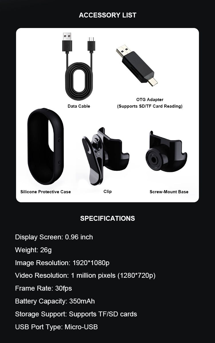 LCDディスプレイ: 0.96インチのLCDディスプレイが搭載されており、撮影したビデオや写真を直接プレイバックすることができます。バッテリー寿命: 完全に充電された状態で2〜3時間の動作が可能です。