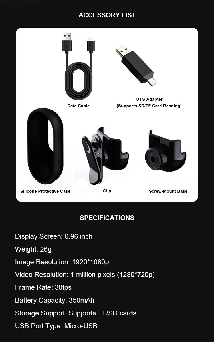 コンパクト設計: 重量はわずか27g(0.95オンス)と非常に軽量で、どこにでも簡単に持ち運べます。多用途なアクセサリー: さまざまなアクセサリーが付属しており、マウンテンバイク、ペットの撮影、旅行、その他の活動に最適です。どんな状況でも簡単に記録が可能です。