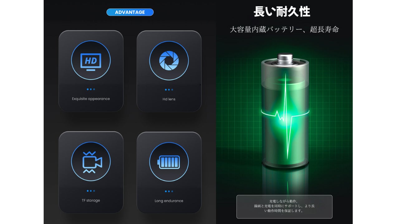 LCDディスプレイ: 0.96インチのLCDディスプレイが搭載されており、撮影したビデオや写真を直接プレイバックすることができます。バッテリー寿命: 完全に充電された状態で2〜3時間の動作が可能です。