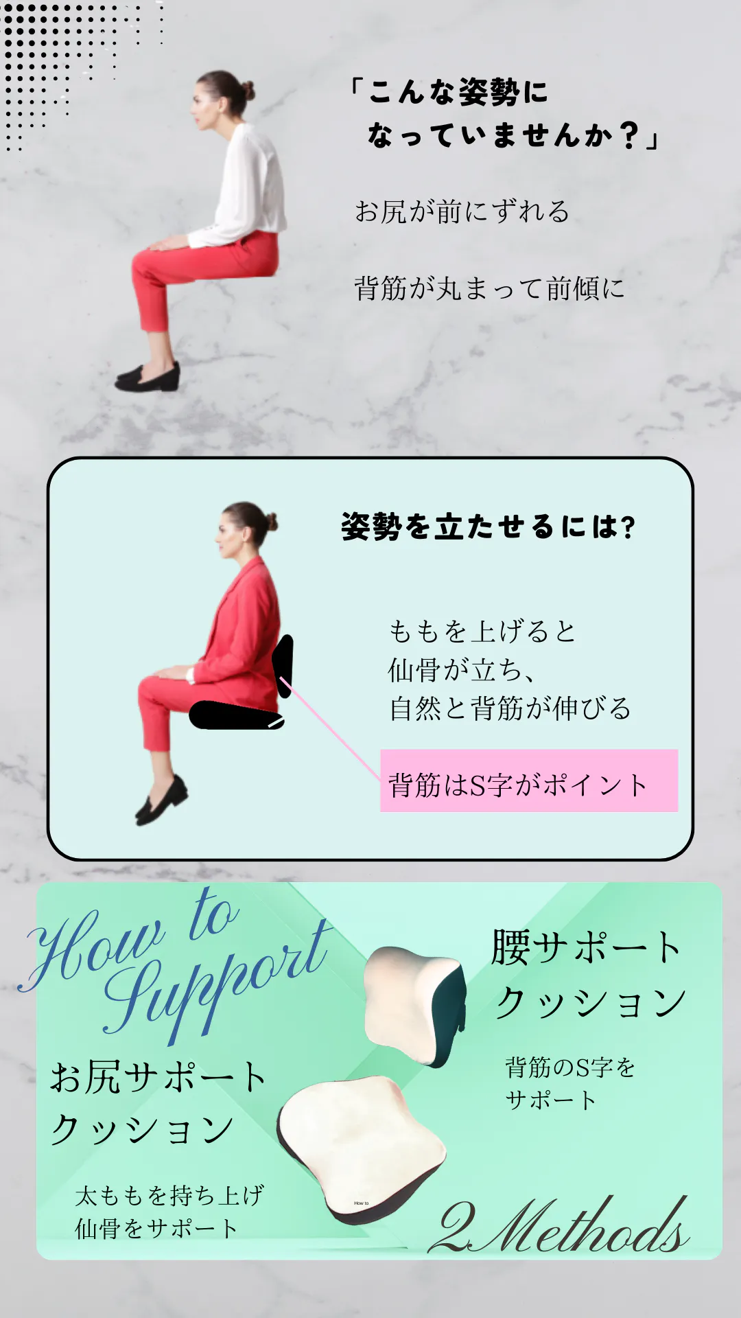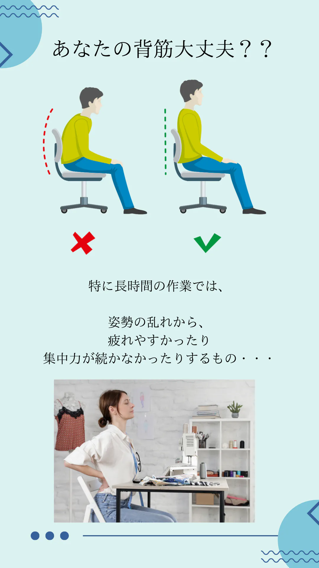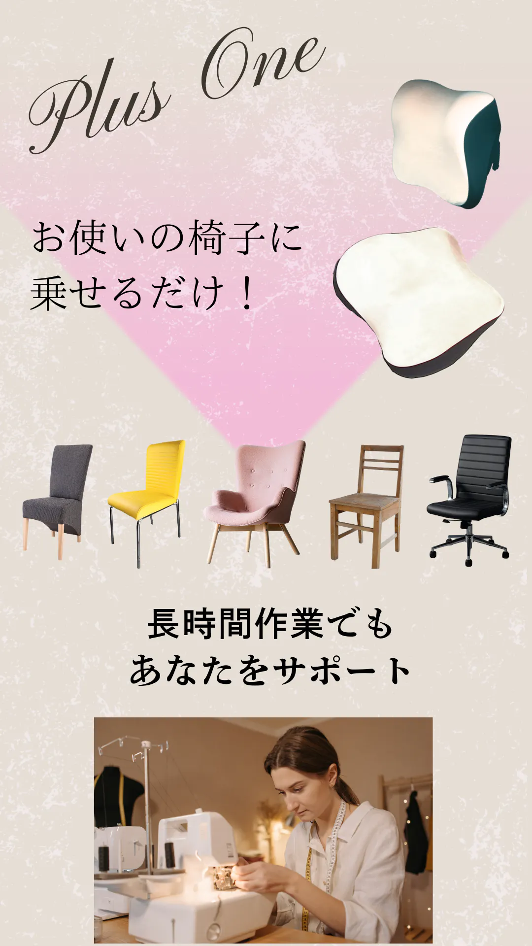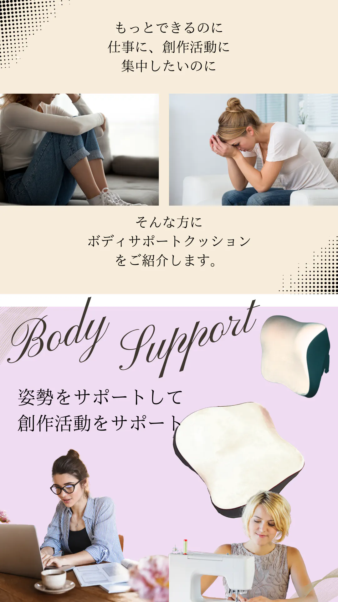 私は長年、オフィスワークをしています。その中で、長時間座り続けることによる腰や肩の違和感に悩まされ、同じような悩みを抱える方々が多いことを感じてきました。この問題を解決するために、快適な座り心地を提供するサポートクッションの開発に取り組んでいます。