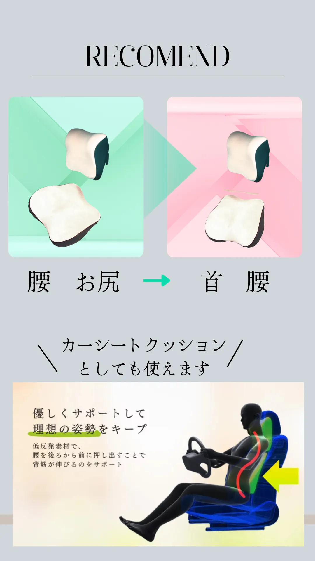 長時間のデスク作業における腰やお尻の負担を軽減するための、サポートクッションです。自然なS字ラインに姿勢をサポートし、身体にフィットするデザインと低反発素材を使用することで、長時間座ることの不快感を軽減します。
