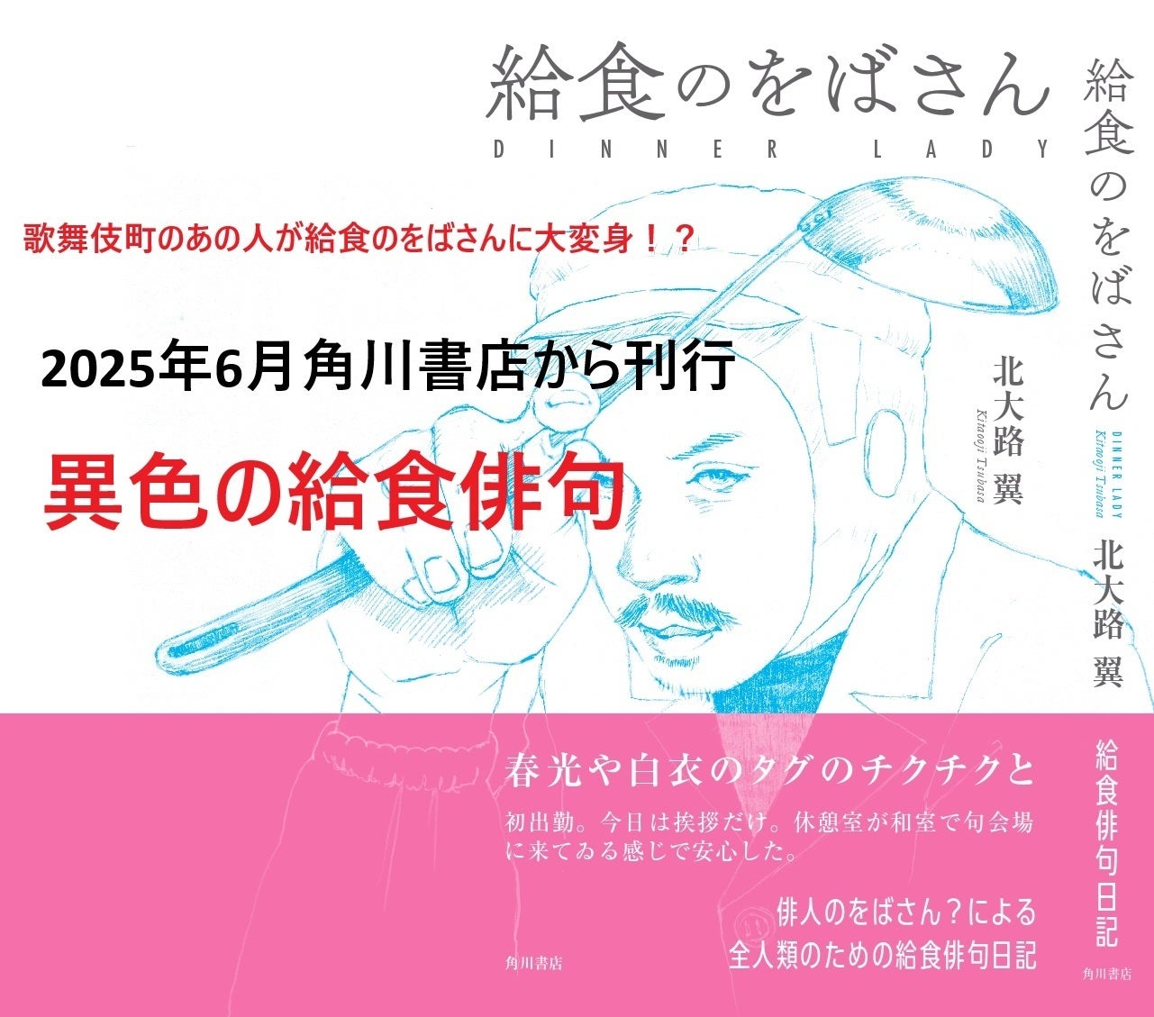 このたび、給食のをばさんとして働いた二年の日々を、俳句日記にしてまとめました。いままでの句集と一風変はつたテイストですのでどなたでも楽しんでもらへると思ひます。従来の俳句ファンだけではなく、幅広い読者の御目に触れるやう祈つてゐます。