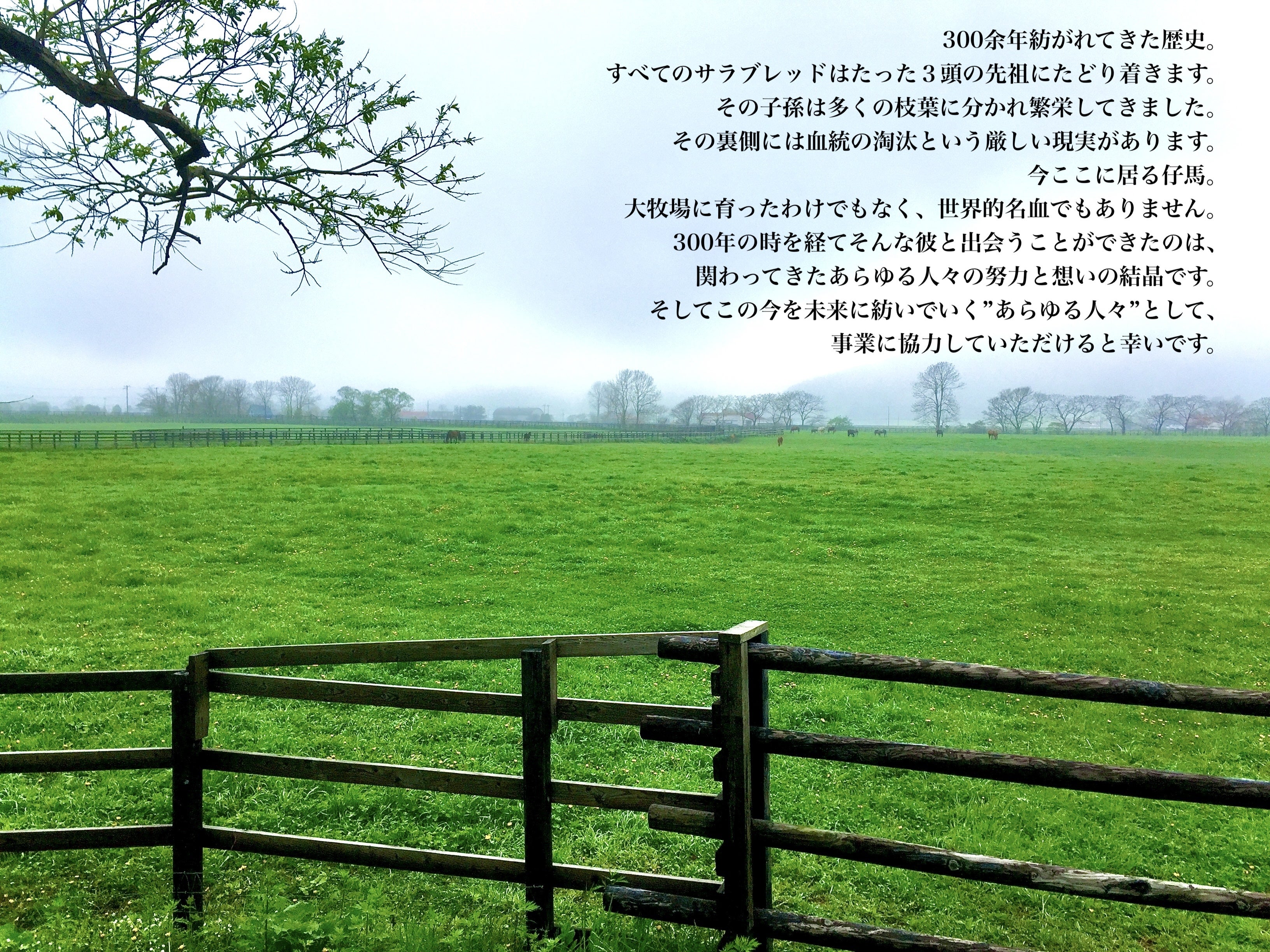 競馬の血統表を遡ると3頭の馬名にたどり着きます。これまで競馬史300年を超える中で多くのホースマン達が「この仔の名を残してあげよう」と、携わった一頭一頭の馬に多くの心血を注ぎ努力してきたのだろうと思います。人間のアスリート同様、ひとり、もしくは一頭の存在に多くの協力者、支援者の助けがあって、一流の存在となることができるのだと思います。もちろん、その過程には失敗や困難があったりもします。多くの手助けがあって栄光を掴むことができるのだと思います。多くの仕事や事業、会社がそうであるように、100年に渡り携わってきた人の夢と希望が、未来へと繋げる為の一片のかけらとして紡いでいきたいと思います。