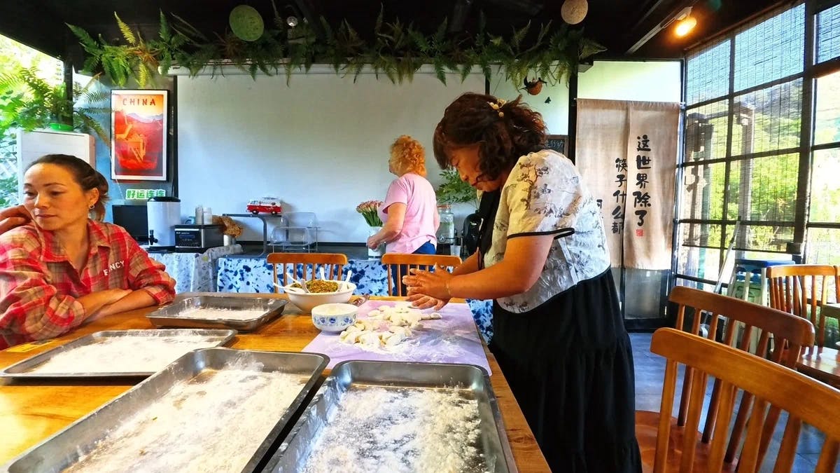 北京のホステルで餃子作り