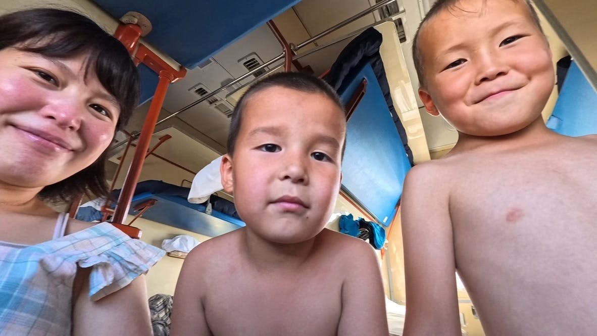ウズベキスタンの列車の中で現地の子供と