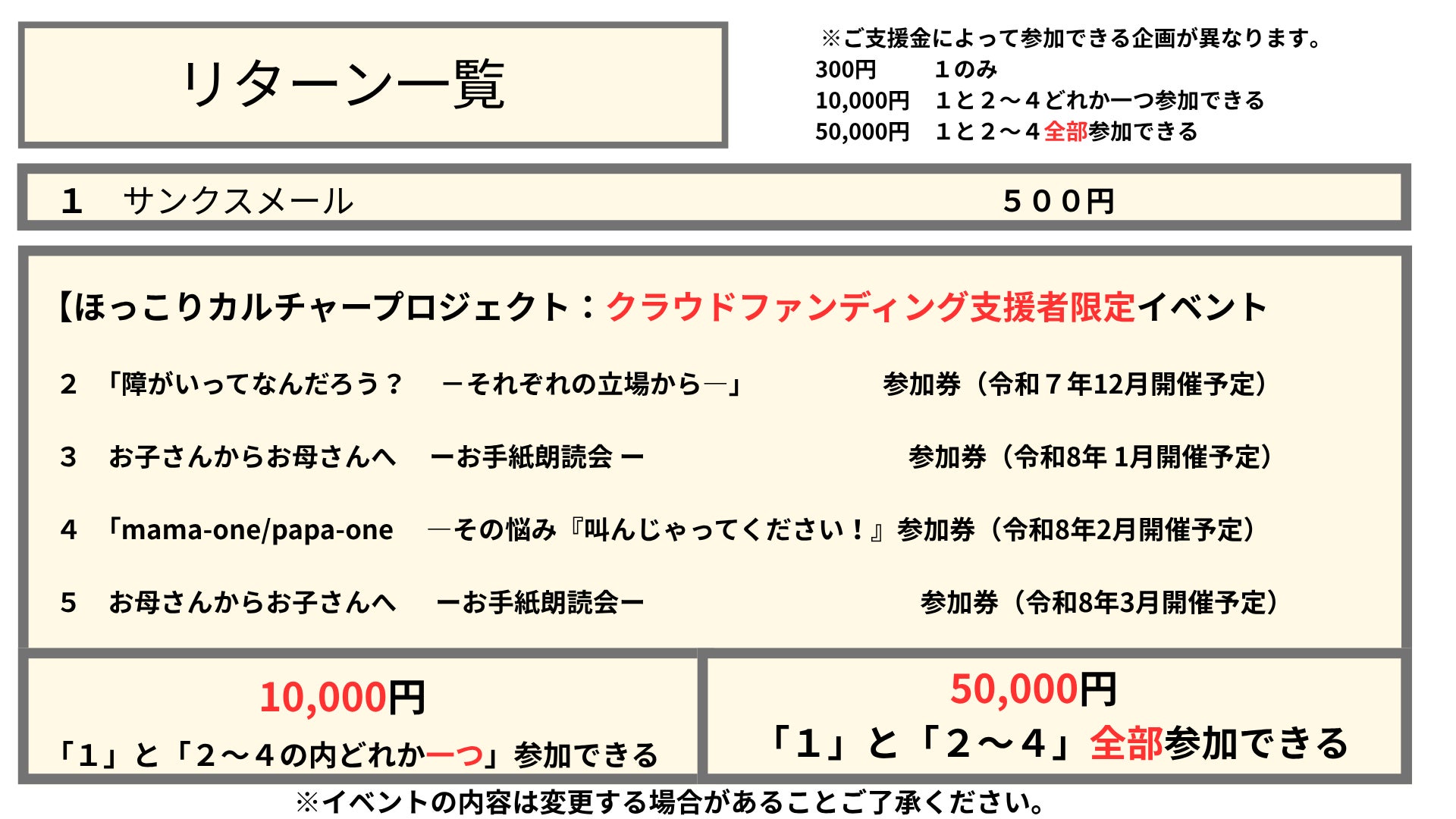 ほっこりカルチャープロジェクト『ご支援者様限定イベント』もリターンにて予定しております。