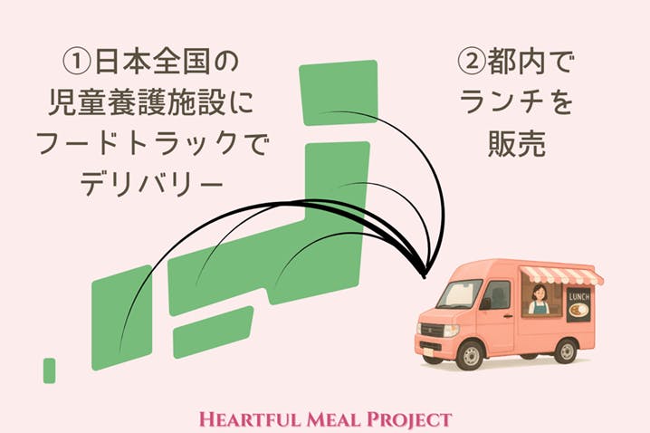 1)キッチンカーで定期的に全国児童養護施設へランチボックスを無償で届けます(3ヵ月に1回を想定)※特にイベントシーズンに力を入れ、許可された施設では、ランチボックスの提供だけでなく、テーブルコーディネート含めたパーティーシーンを演出します