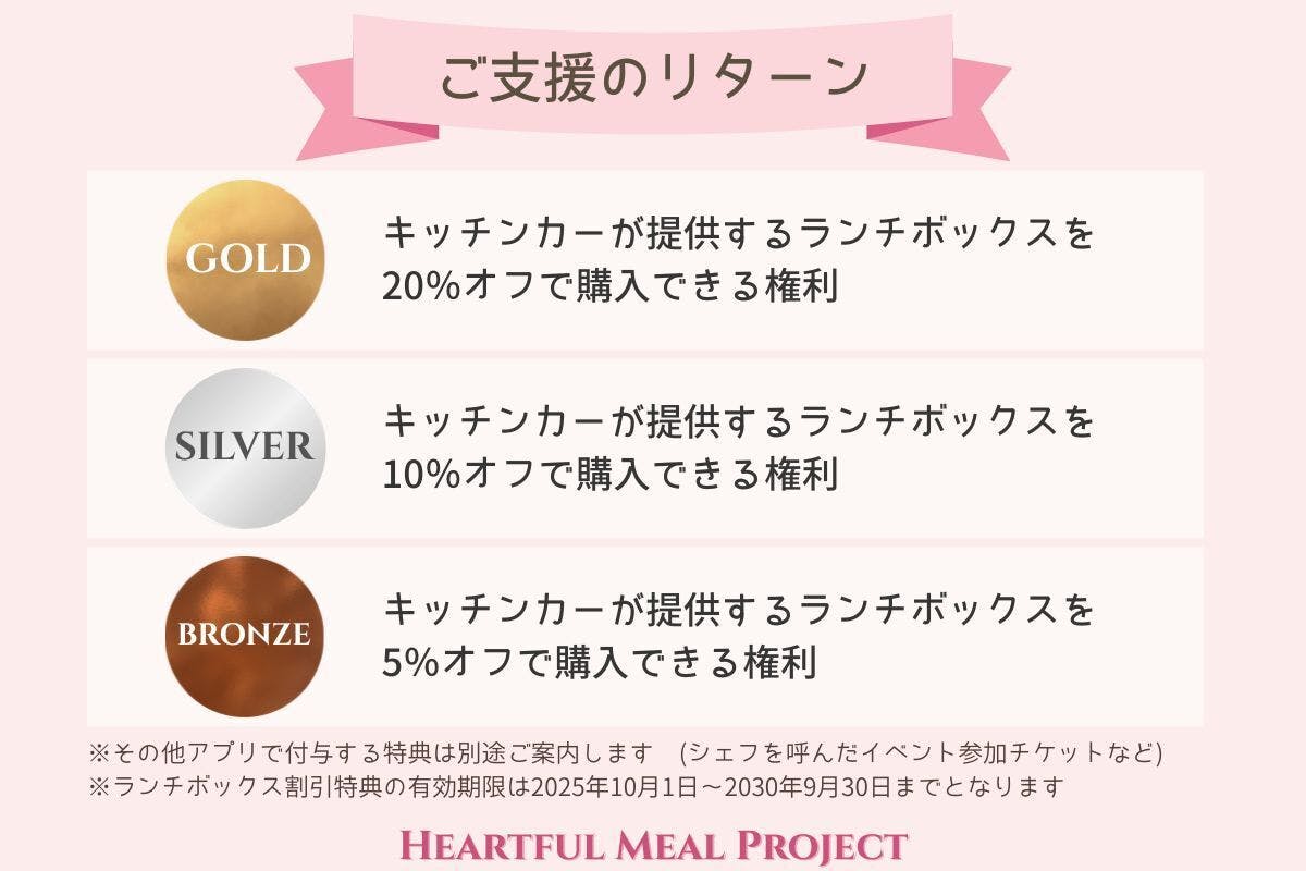 皆さまには、Heartful Meal Projectファウンダーバッチとして以下のリターンを提供します。